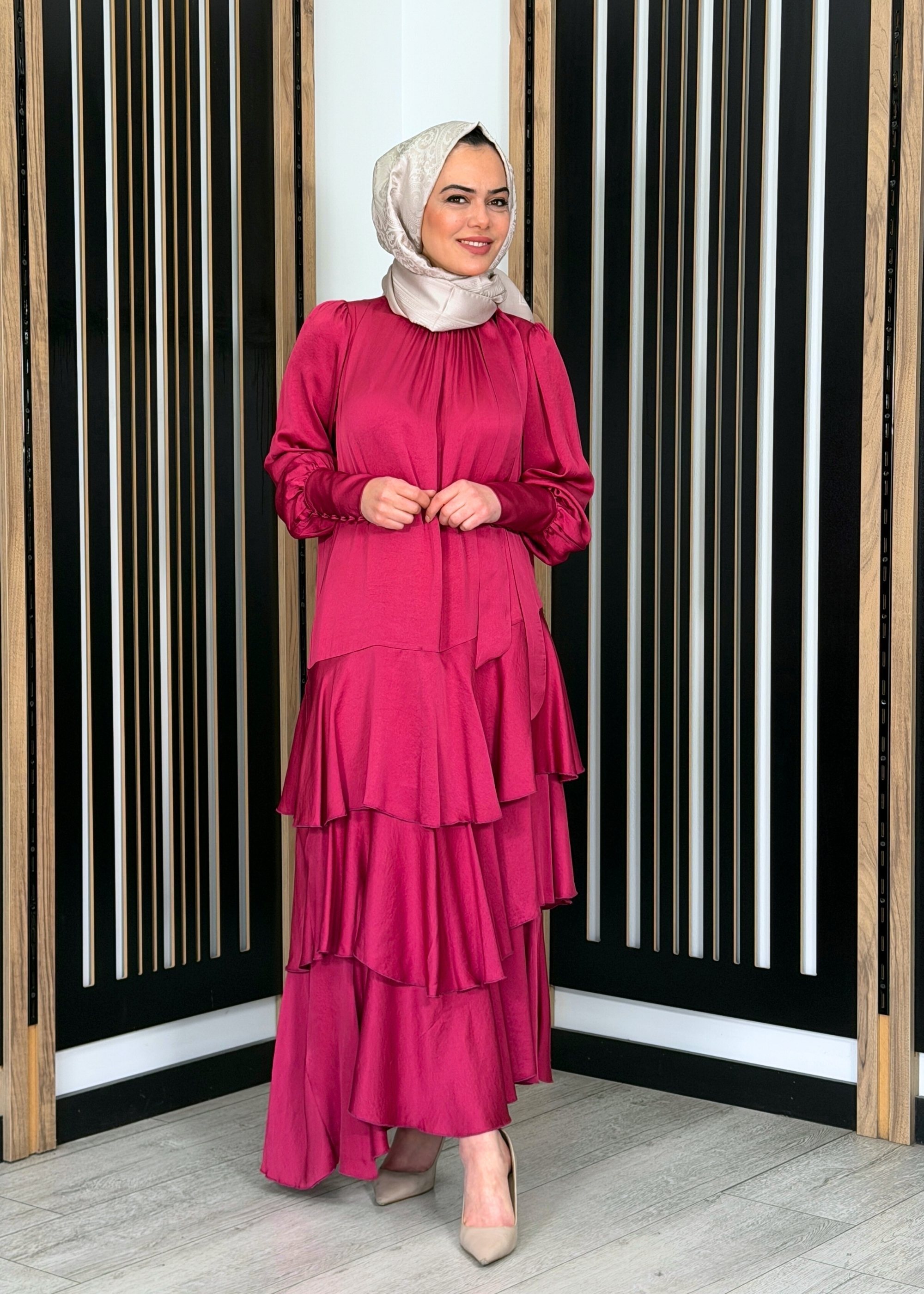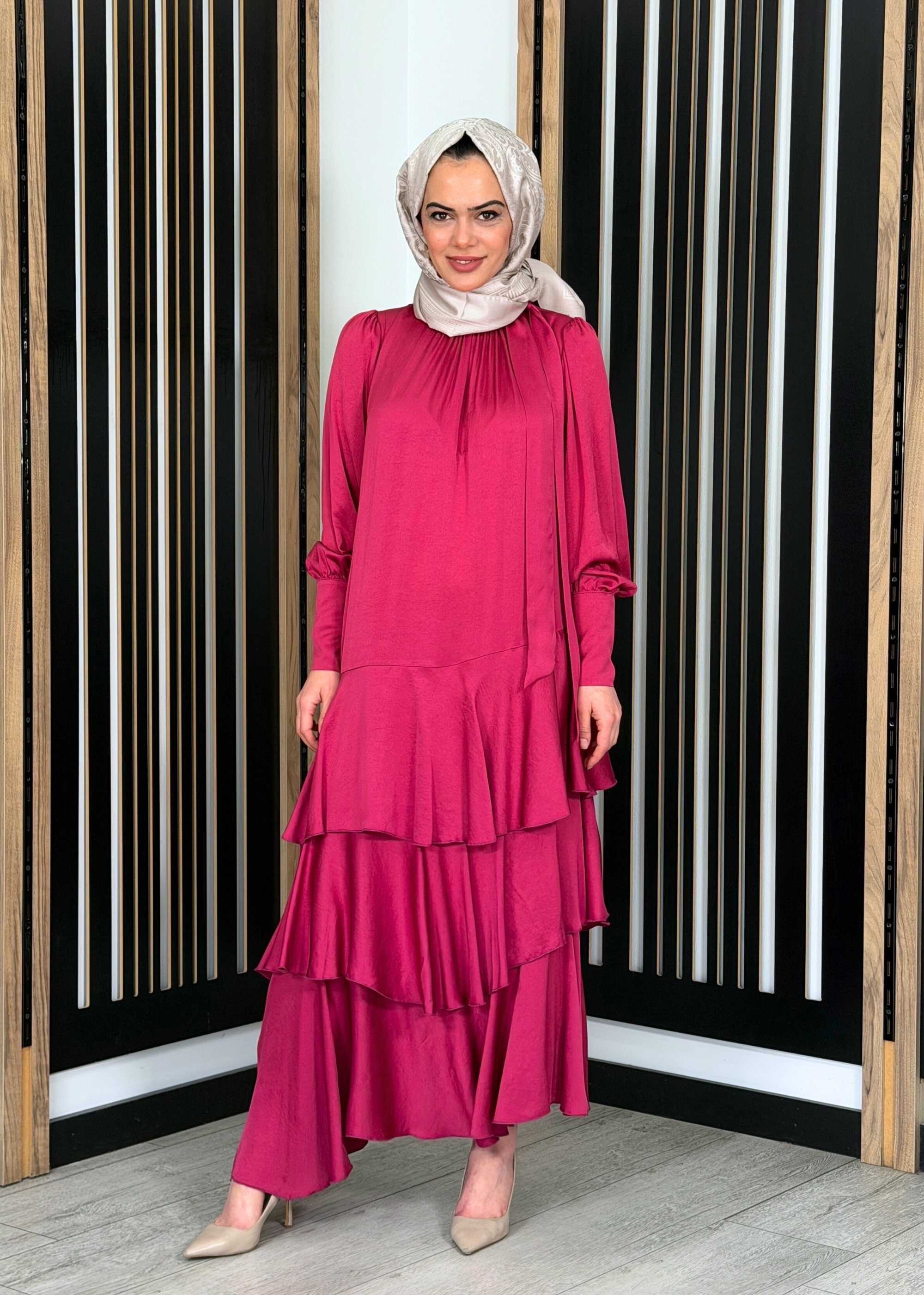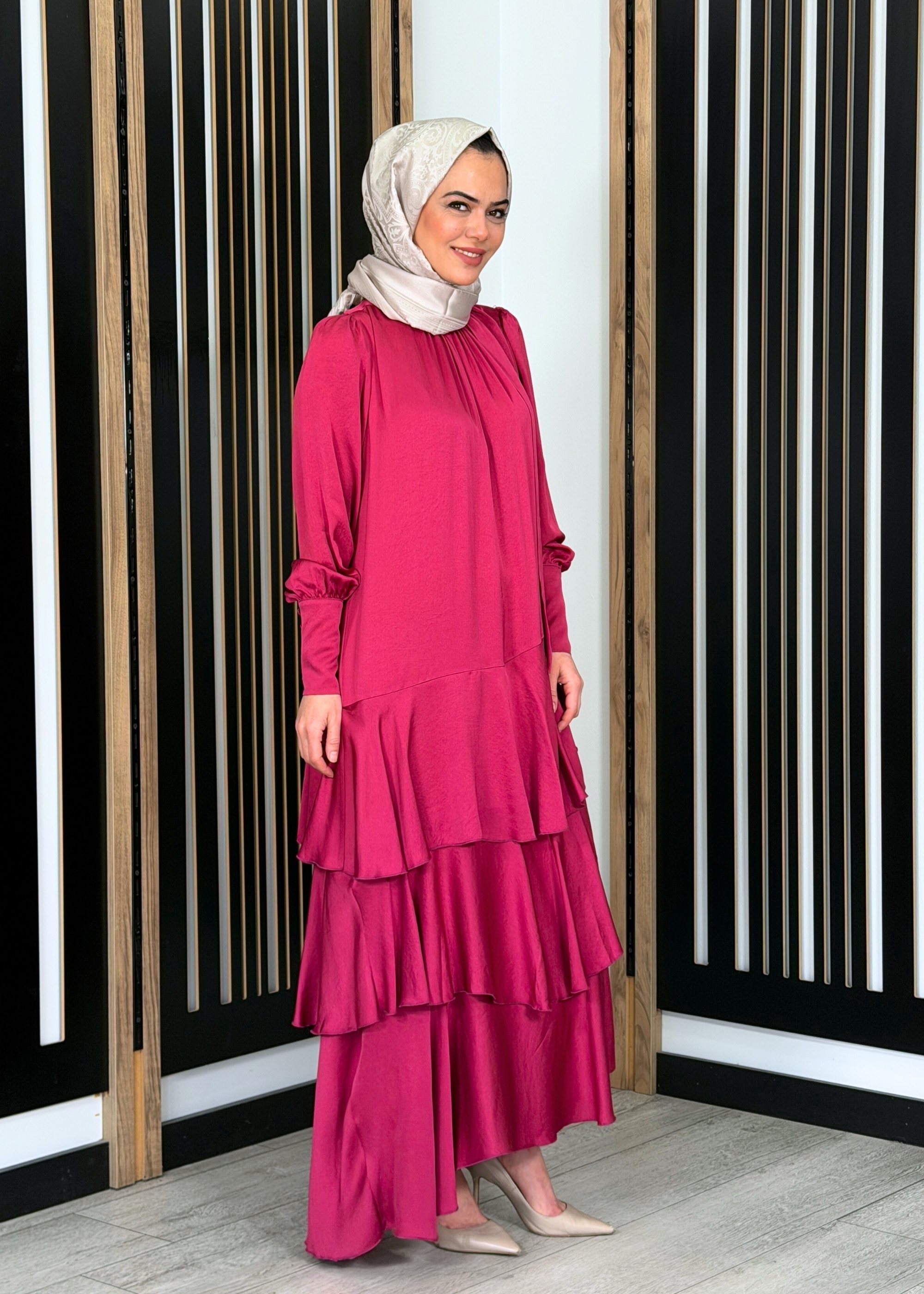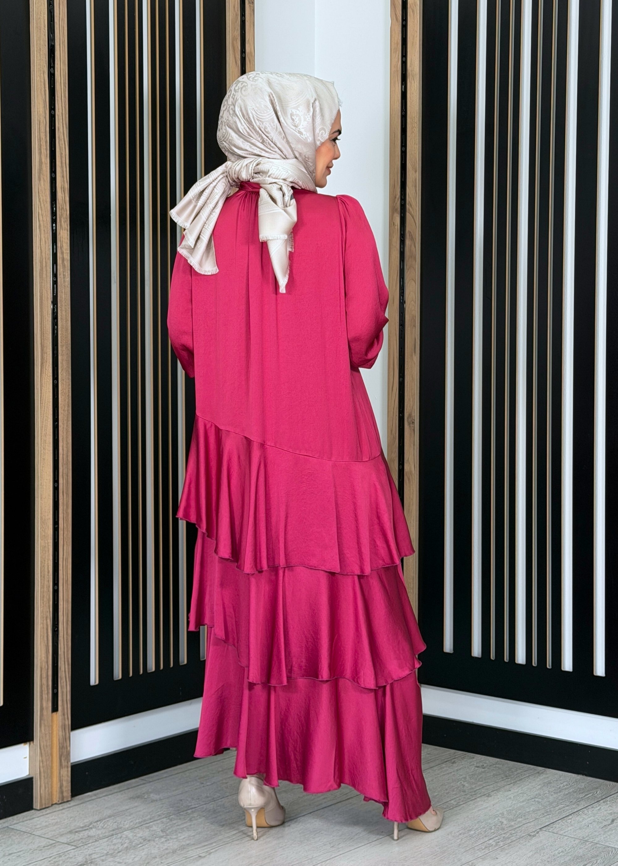 Noİ Viscon Mistik Fularlı Yaka Eteği Volanlı Elbise FUŞYA