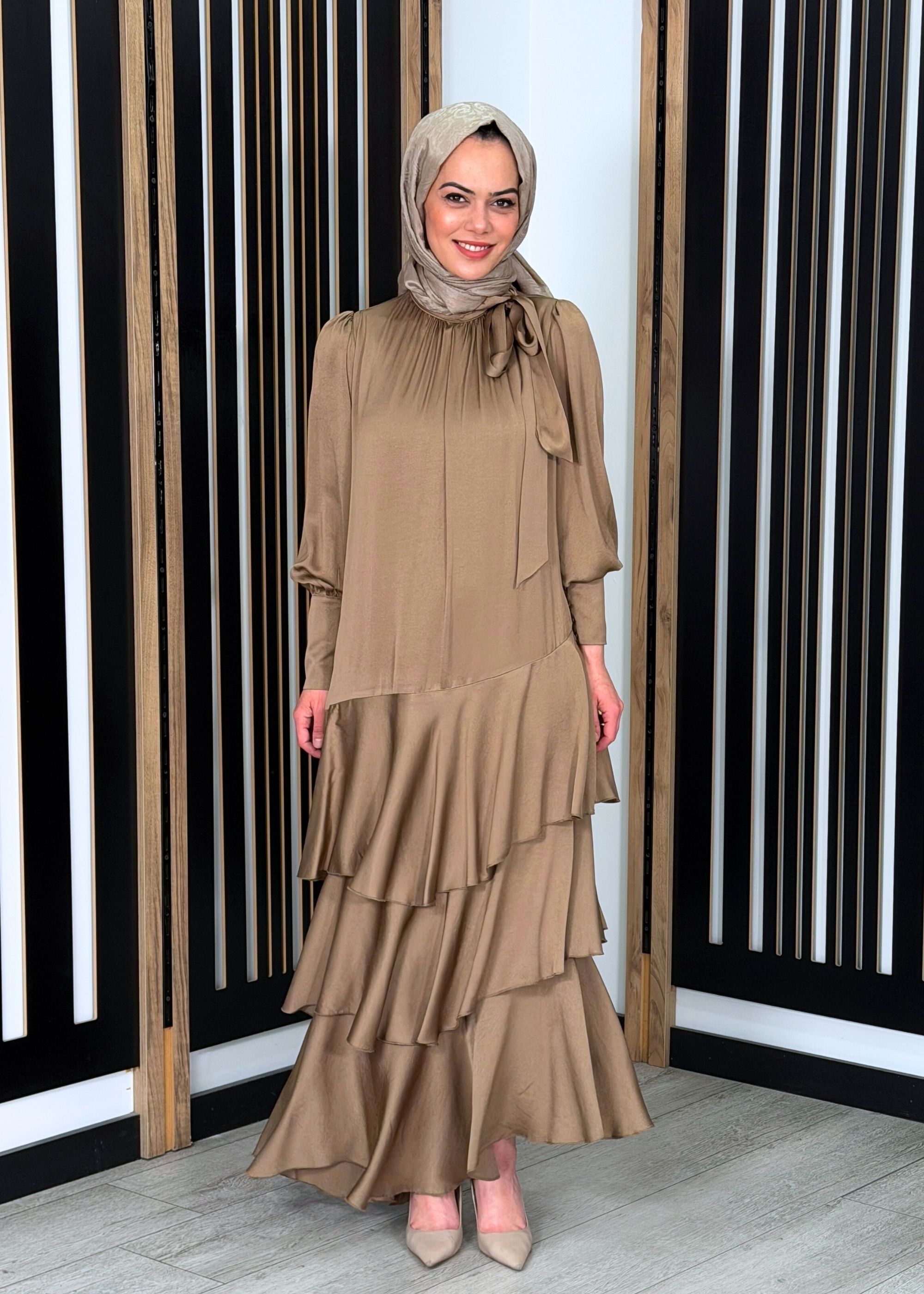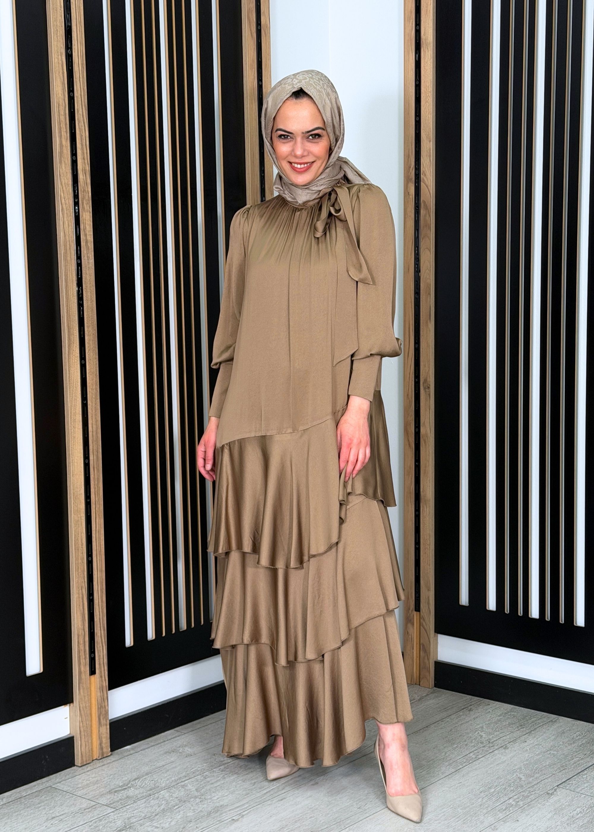 Noİ Viscon Mistik Fularlı Yaka Eteği Volanlı Elbise VİZON