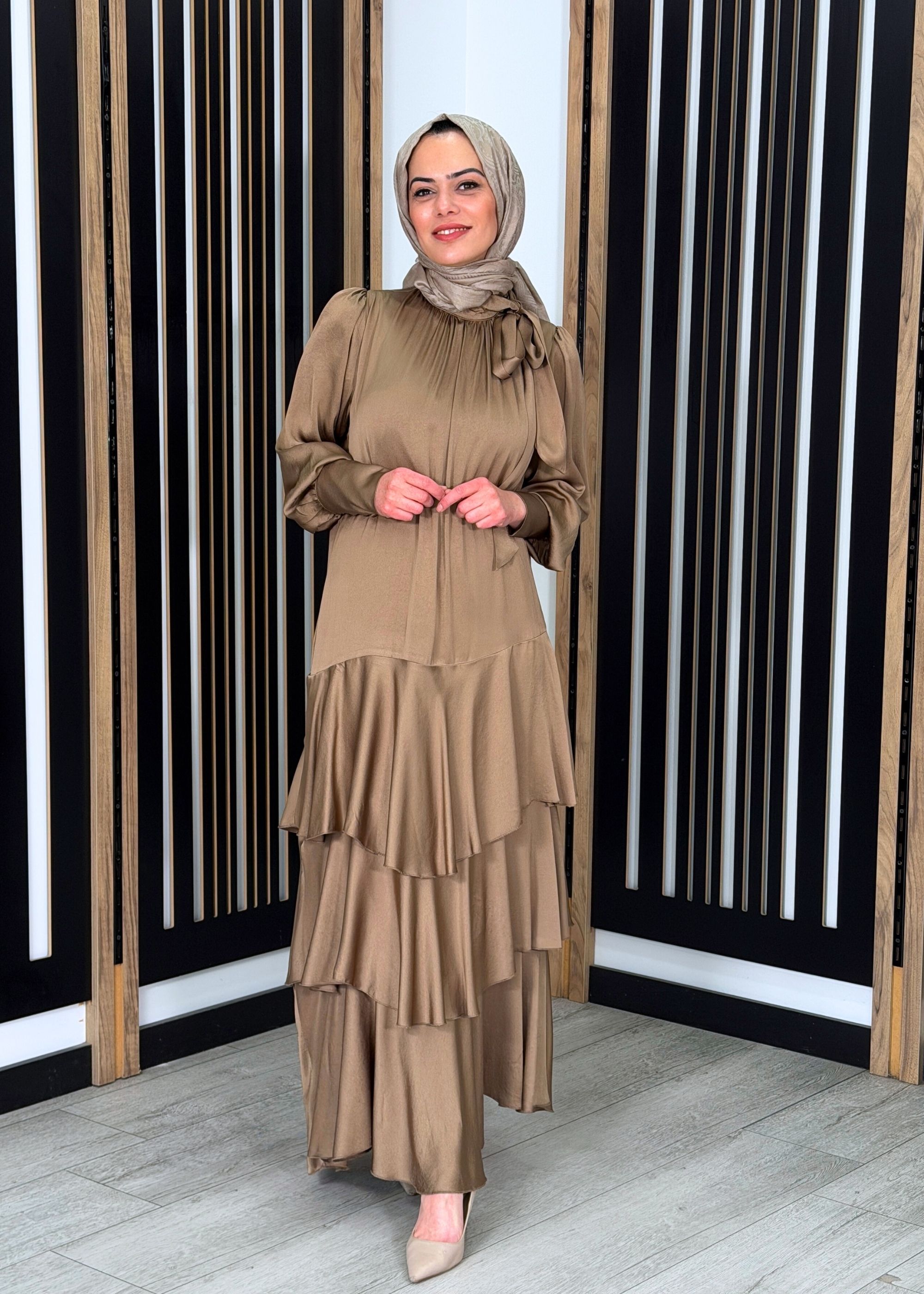 MissWhence Şallı Kuşaklı İpek Elbise KAHVE