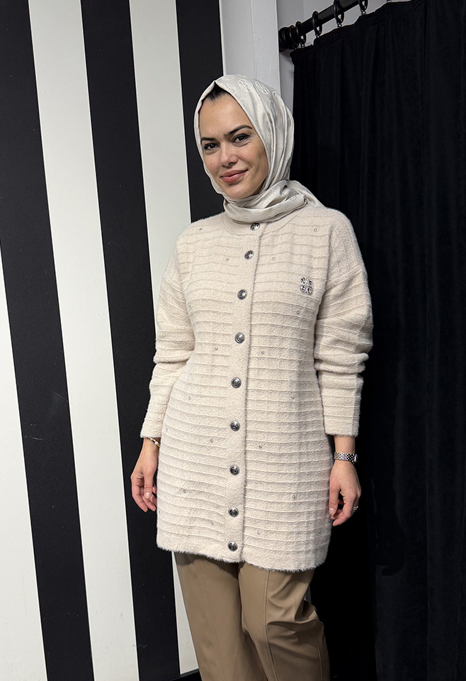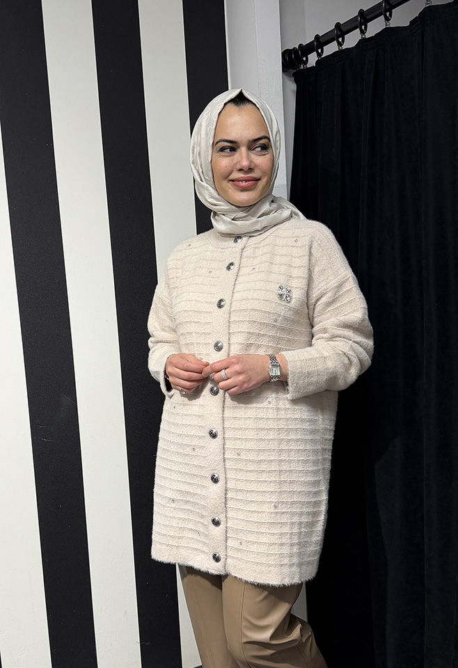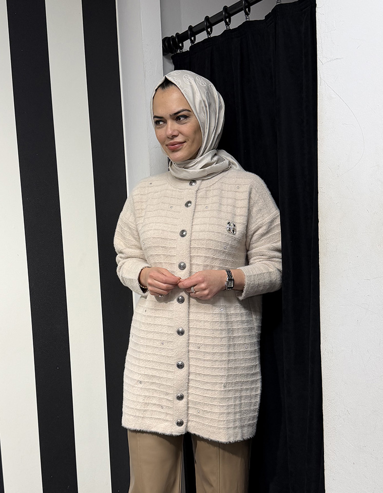 Nuss Çizgili Taş Detaylı Hırka BEJ