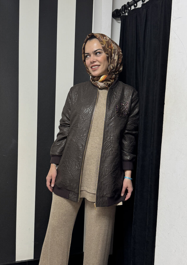 Nuss Önü Boncuk İşlemeli Fermuarlı Kap KAHVE