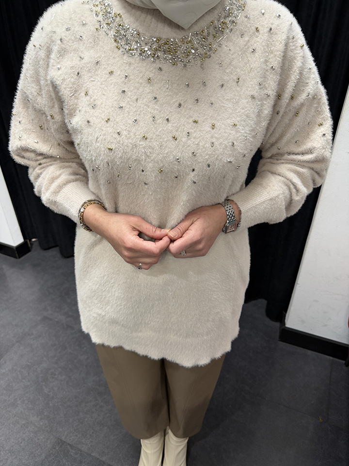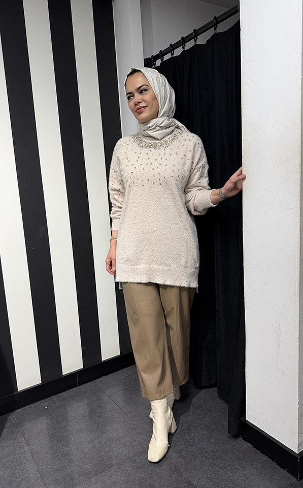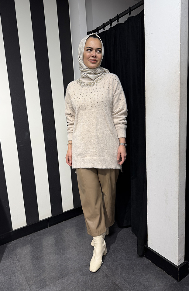 NiQozza Yasemin İthal Cepli Triko Kazak EKRU