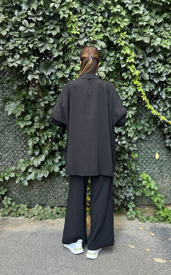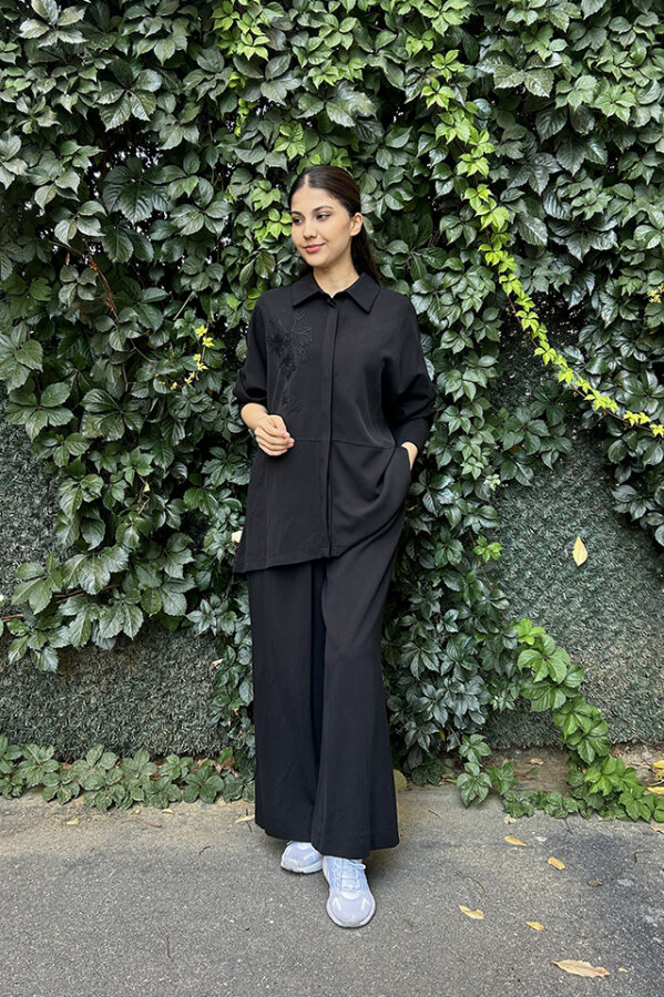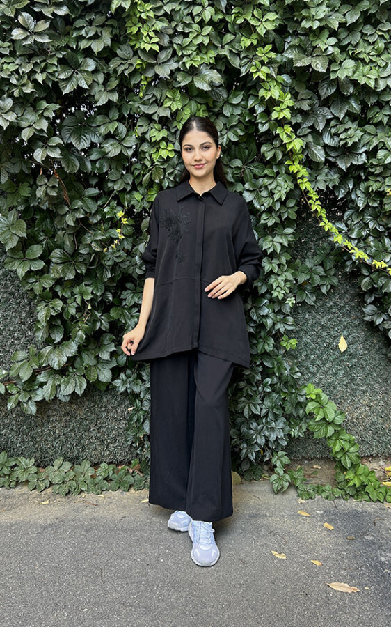 Nuss Önü Çiçek İşlemeli Pantolonlu Takım SİYAH