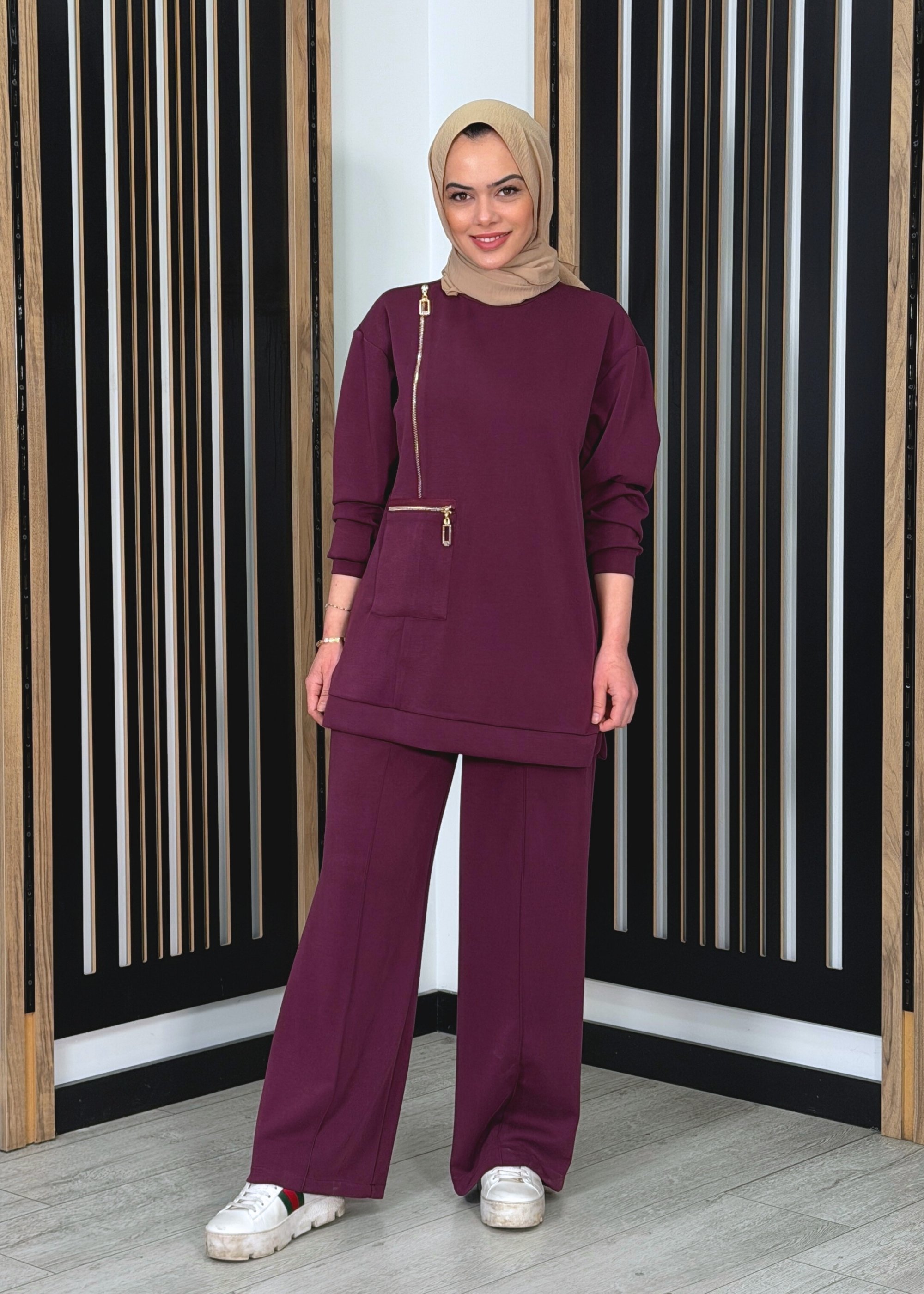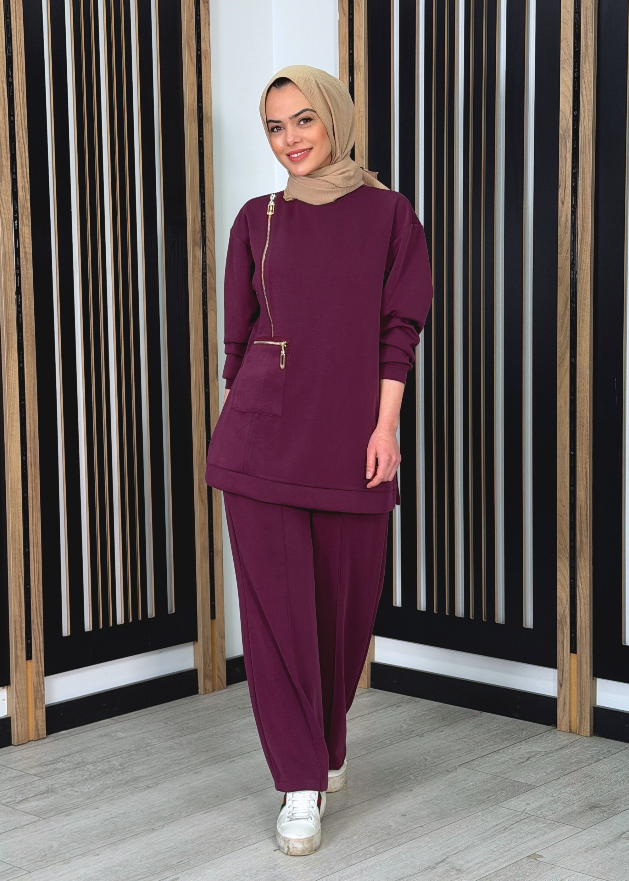 Nuss Önü Fermuar Detaylı Pantolonlu Takım MÜRDÜM