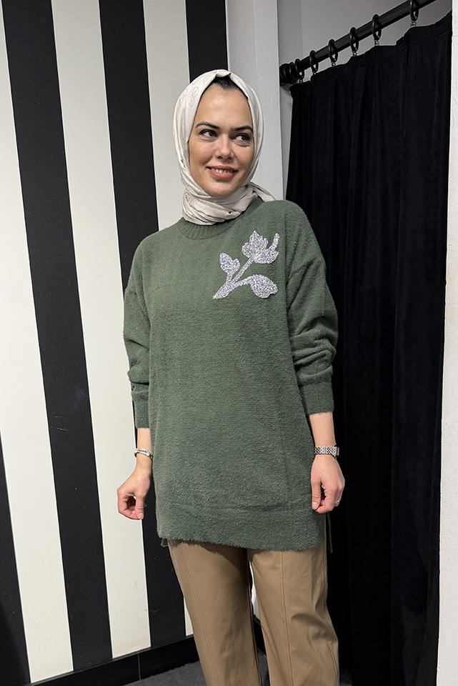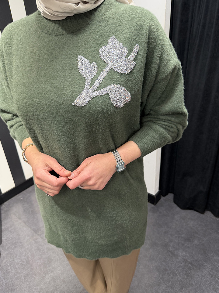 Nuss Önü Taş Çiçek İşlemeli Tunik HAKİ