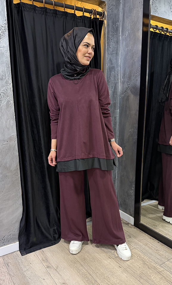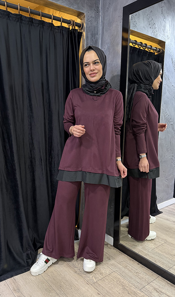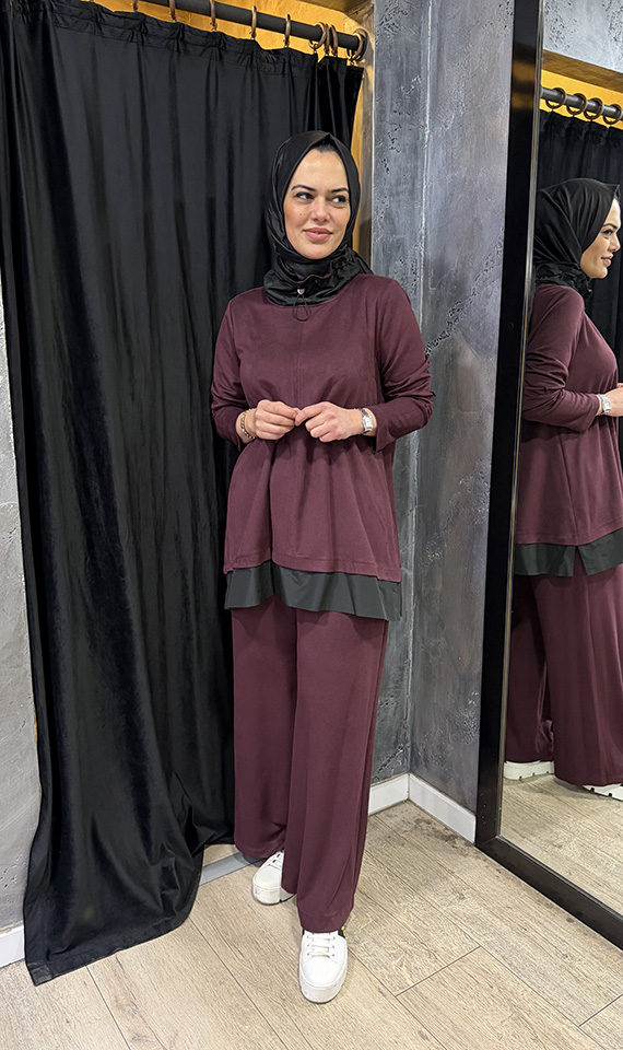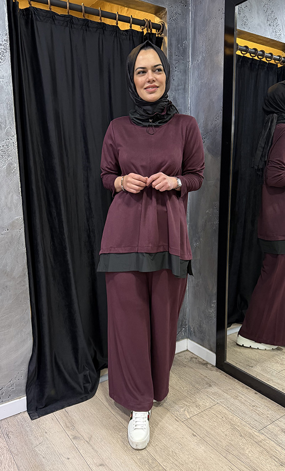 Nuss Yakası ve Etek Ucu Paraşüt Pantolonlu Takım BORDO