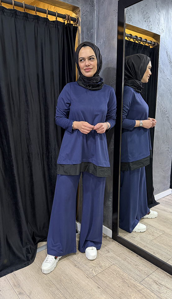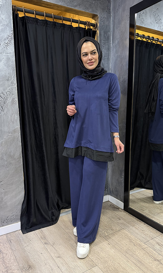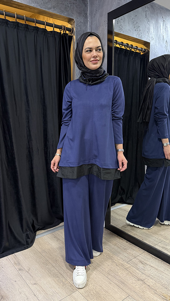 Nuss Yakası ve Etek Ucu Paraşüt Pantolonlu Takım İNDİGO