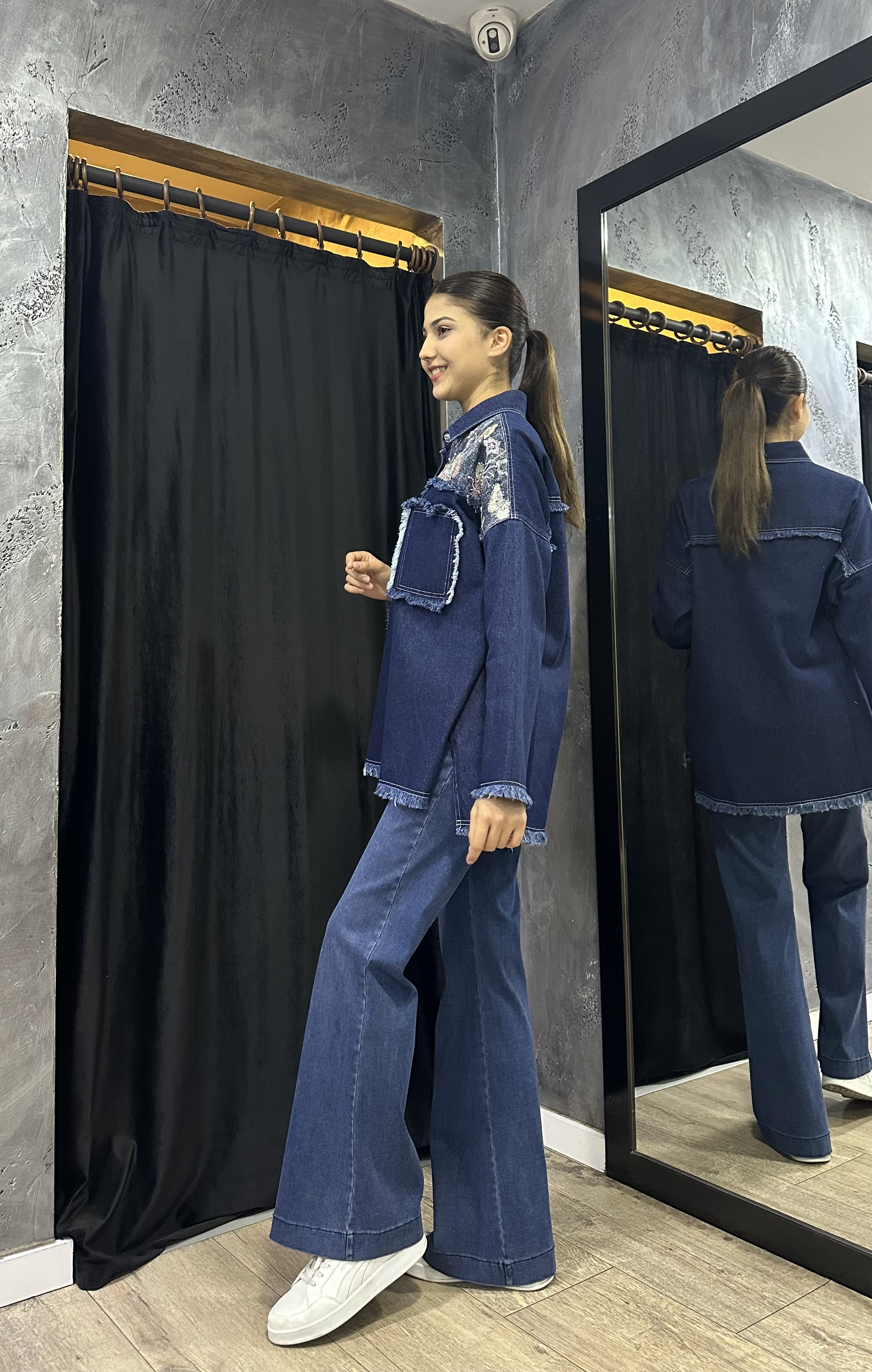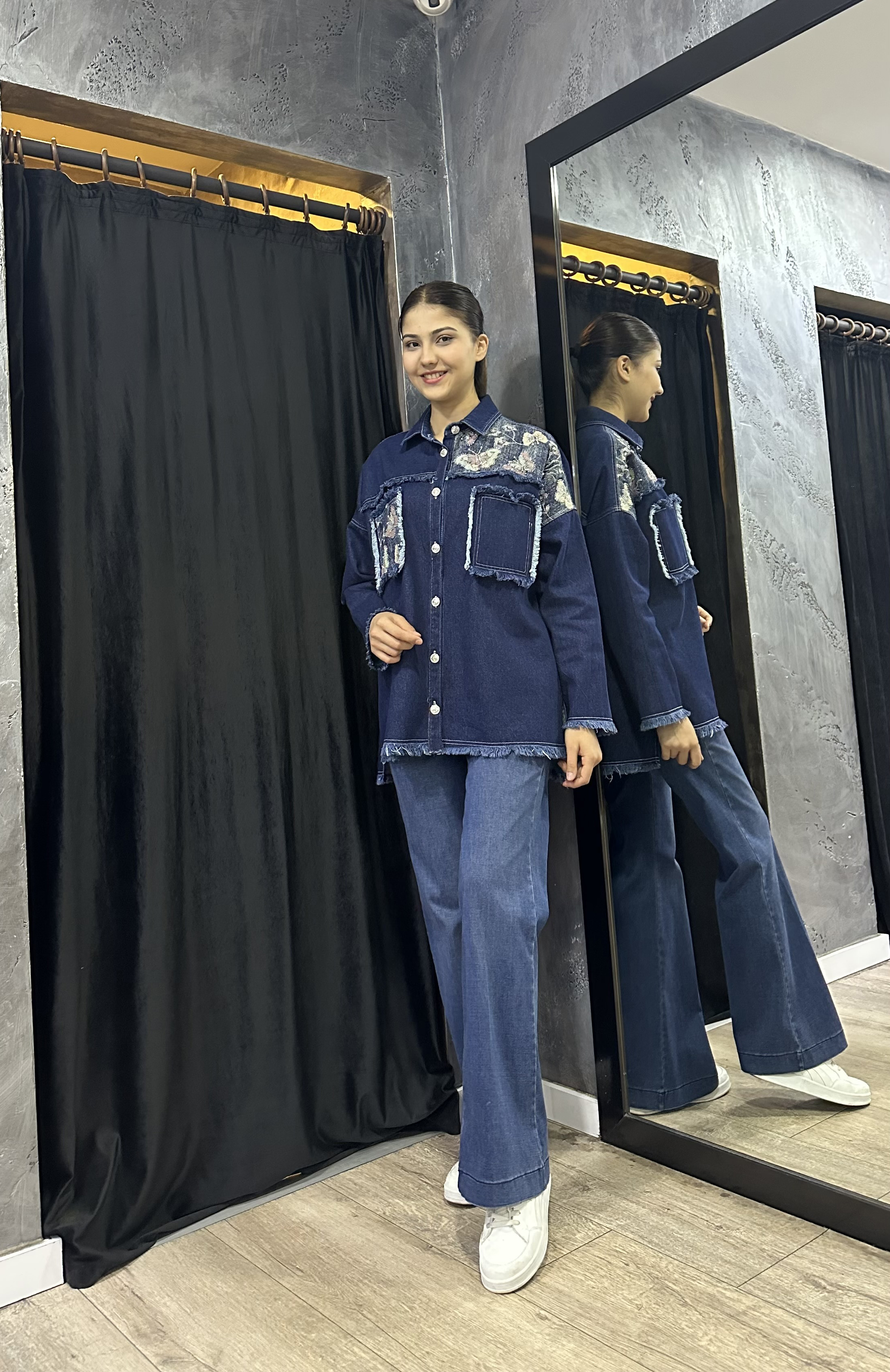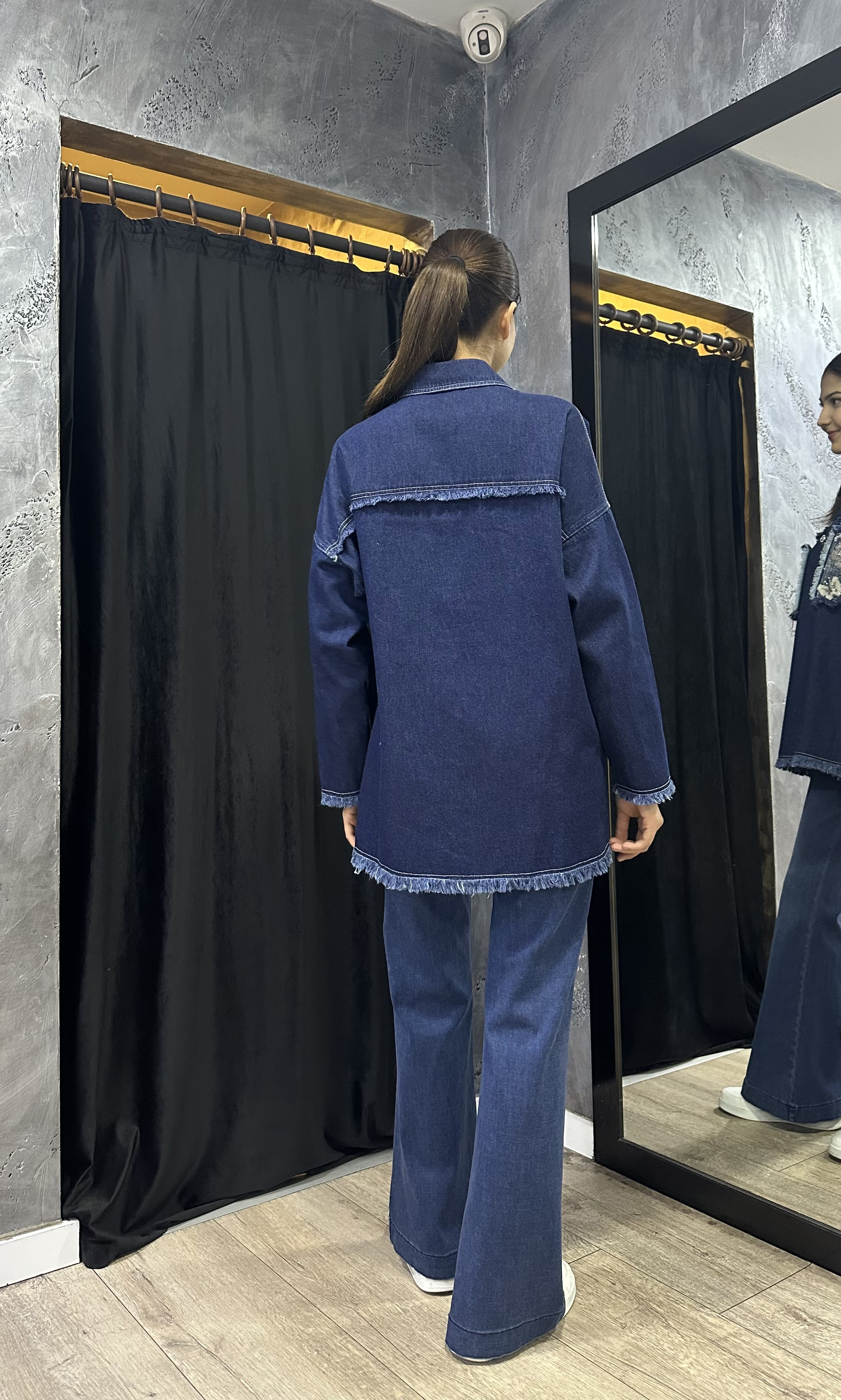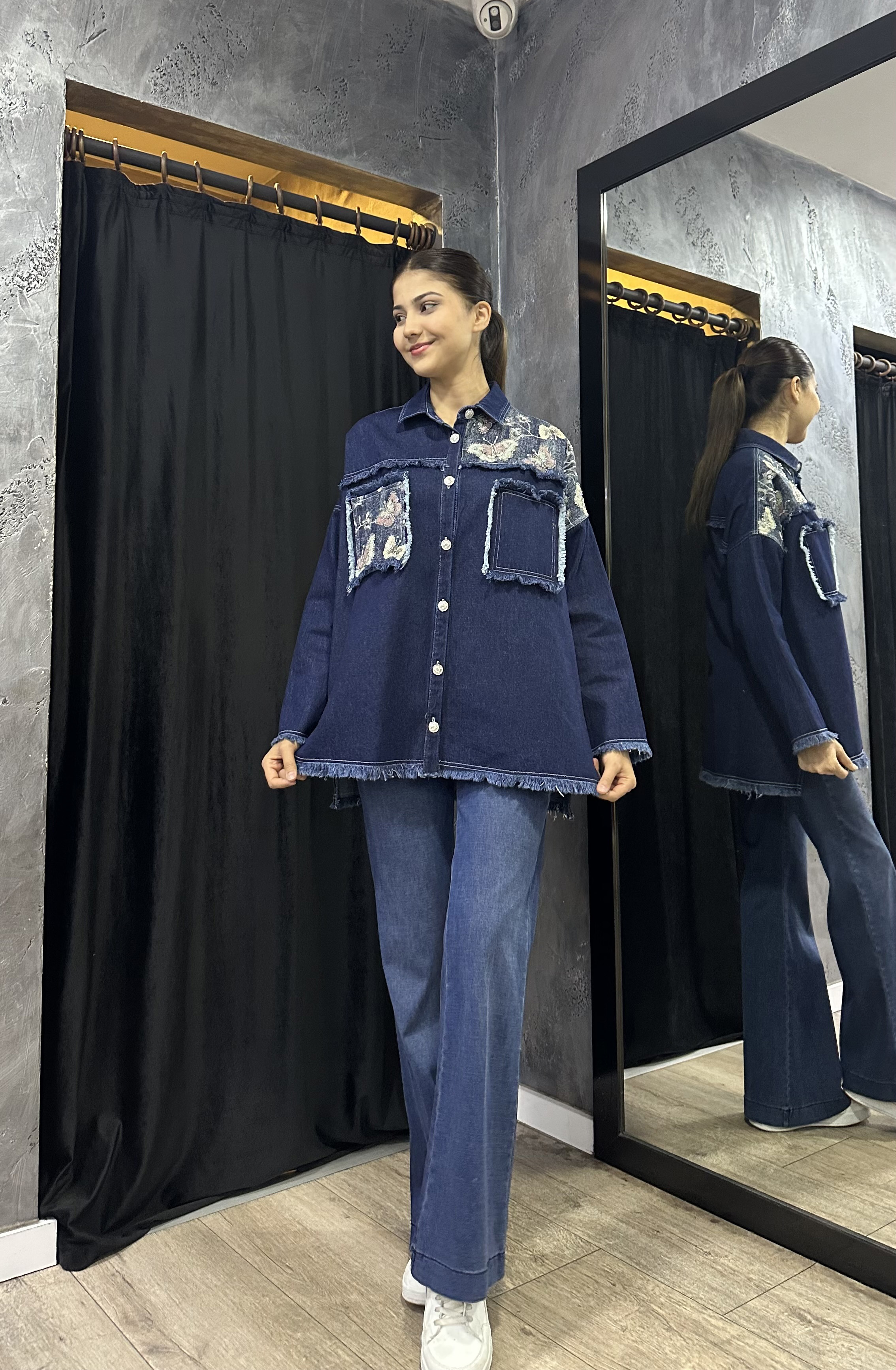 Miss Dalida Gömlek Yaka Denim Detaylı Uzun Ceket İNDİGO