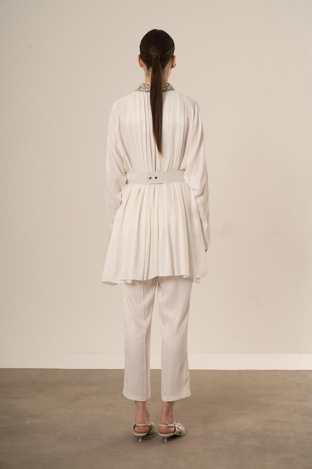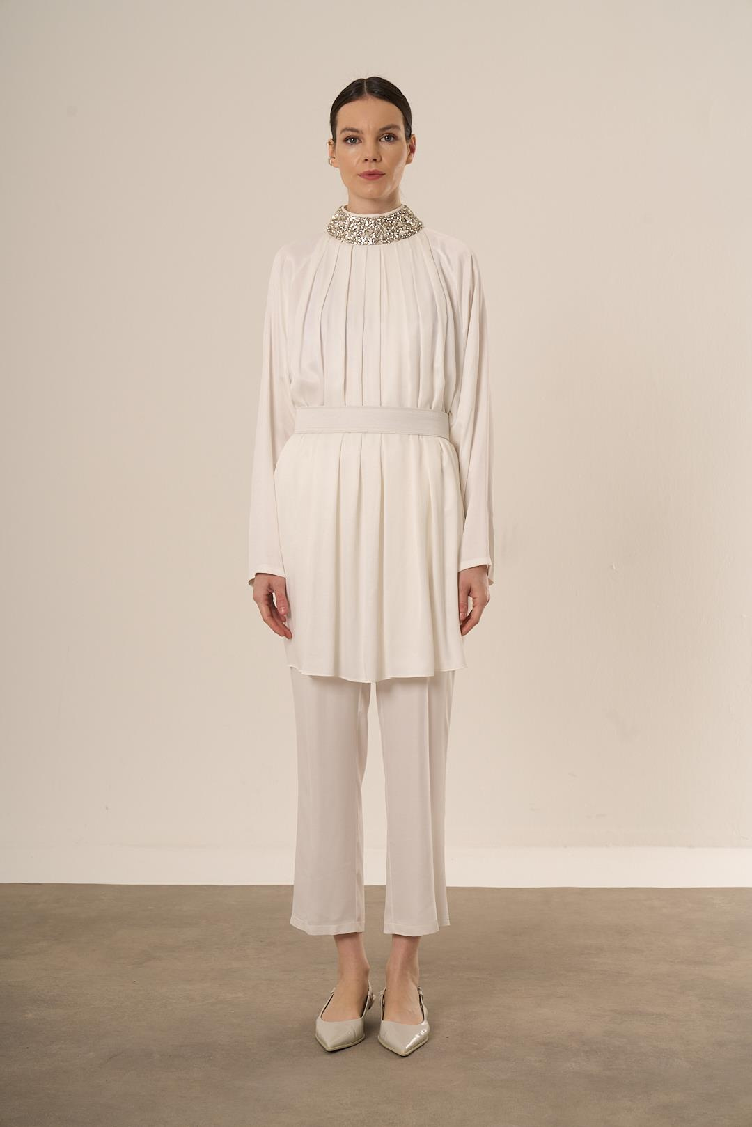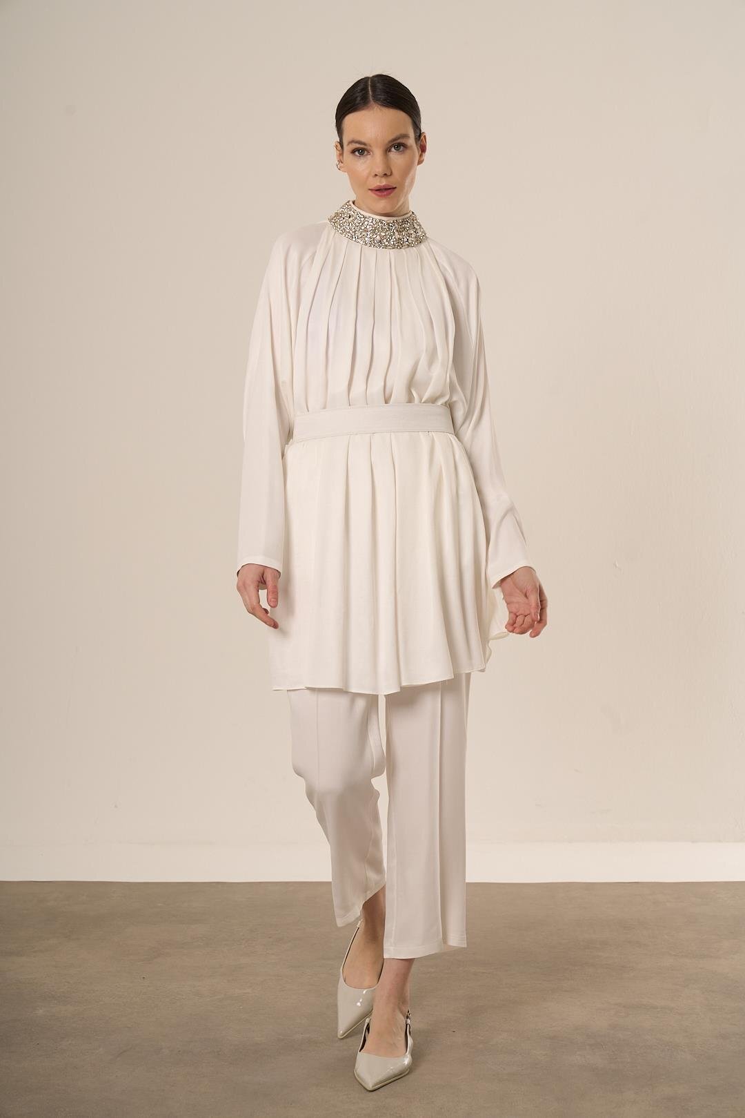 Qupra Boğazı Taşlı Kemer Detaylı Takım EKRU