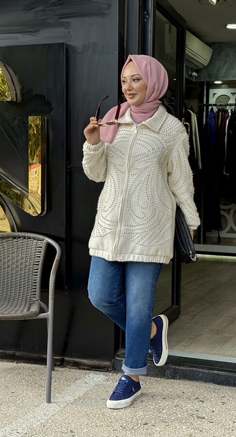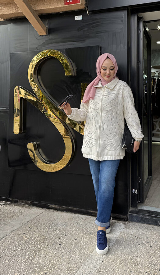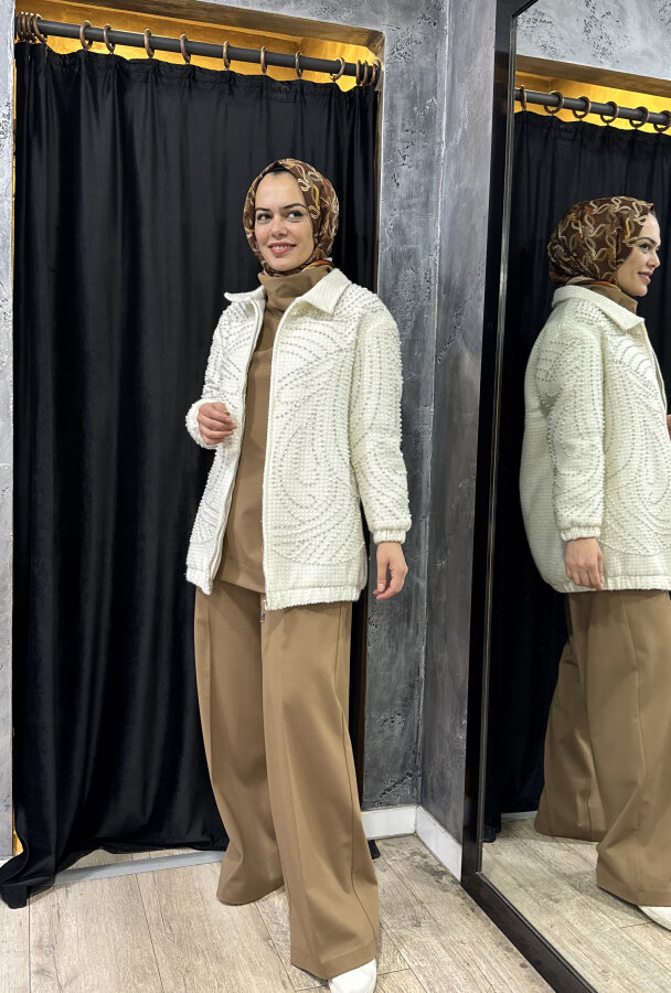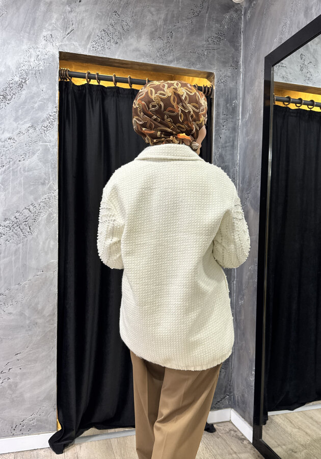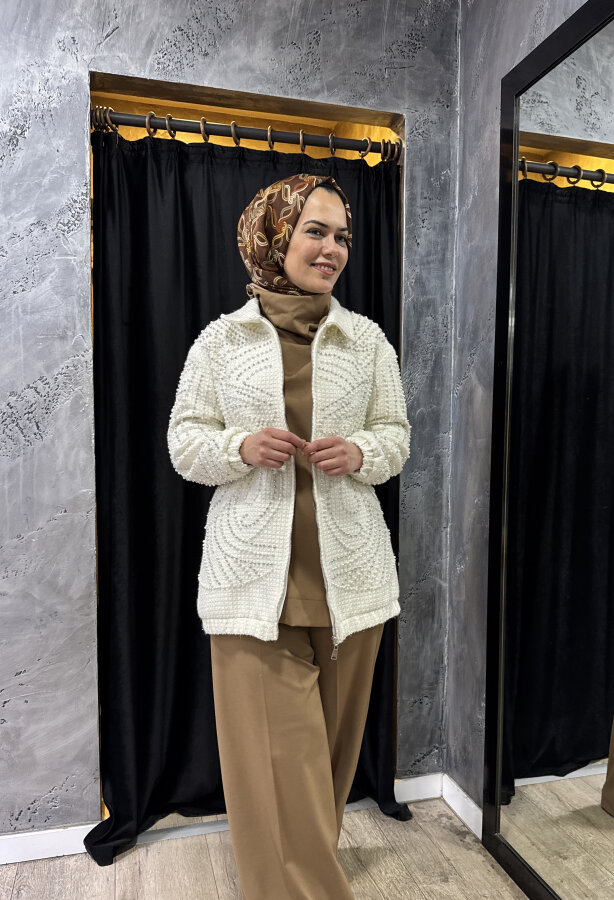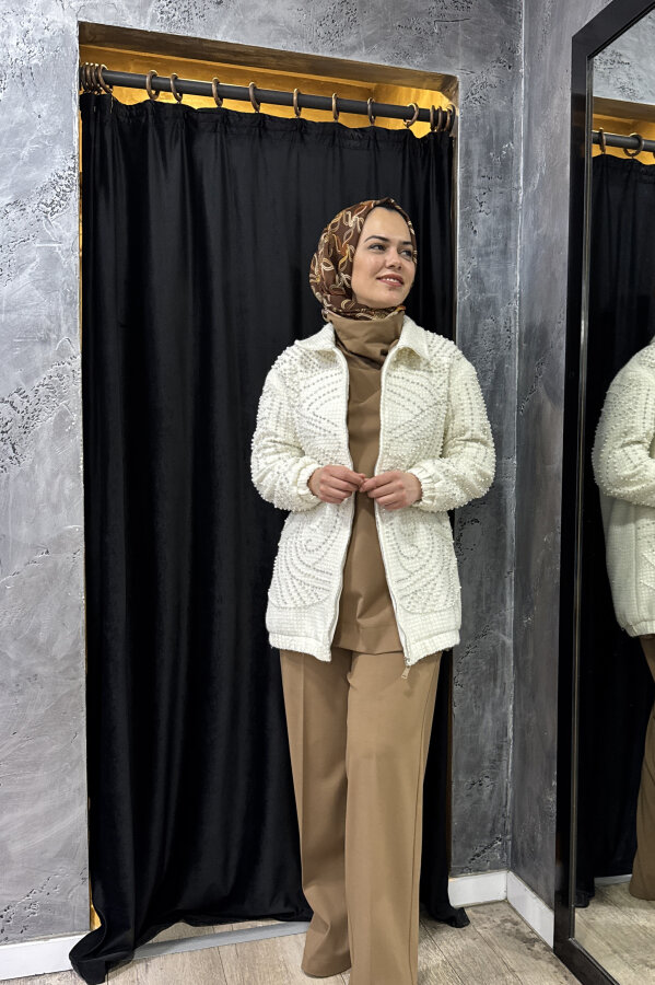 Qupra İnci Aksesuarlı Roma Bomber Ceket EKRU