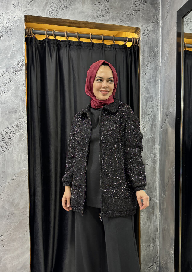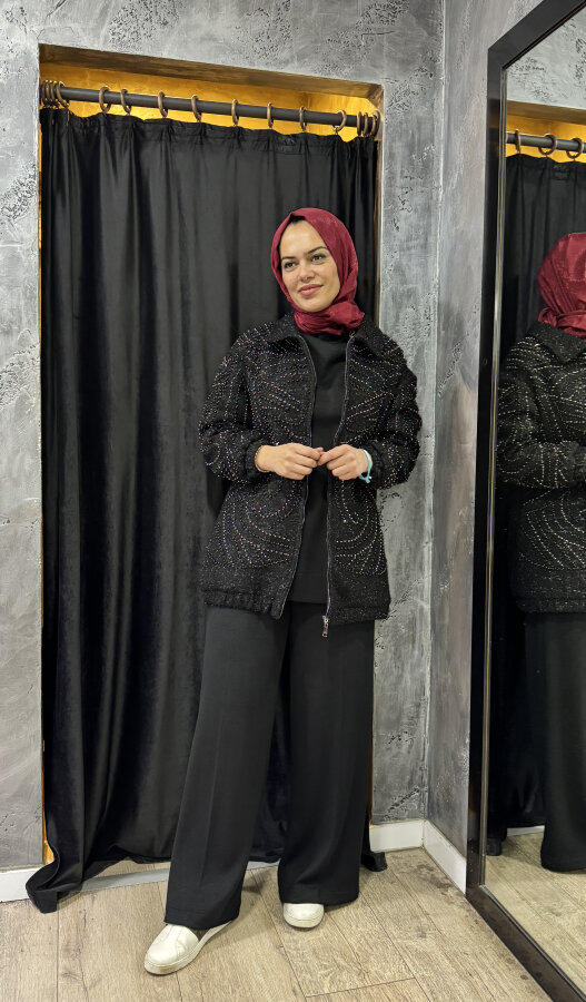 Qupra İnci Aksesuarlı Roma Bomber Ceket SİYAH