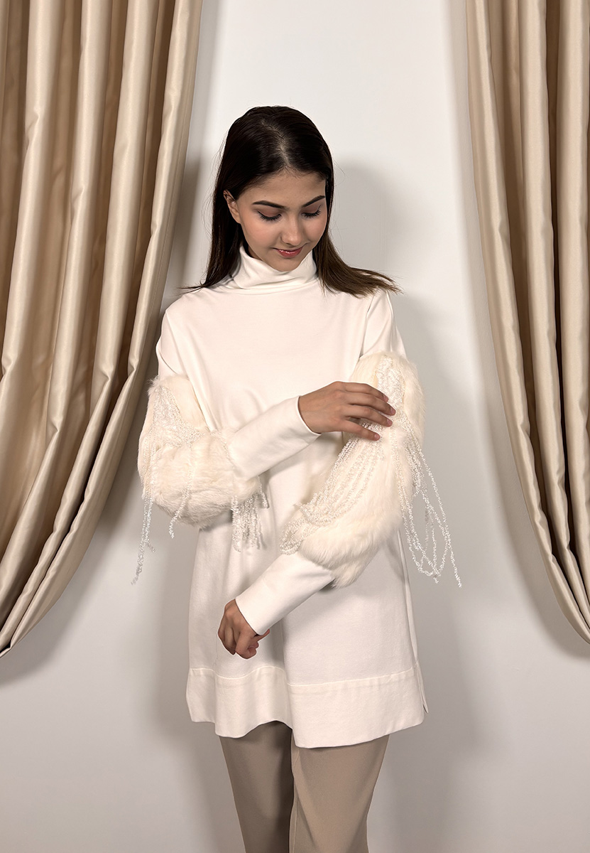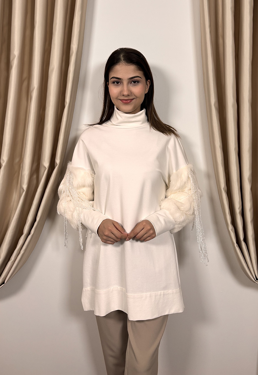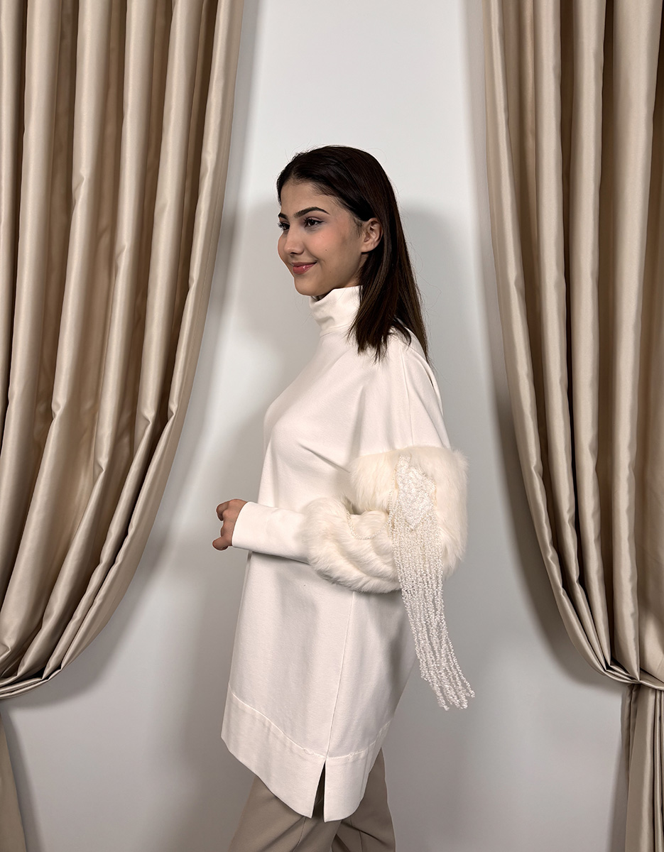 Qupra Kolları Kürk Ve Salkım Detaylı Tunik BEYAZ