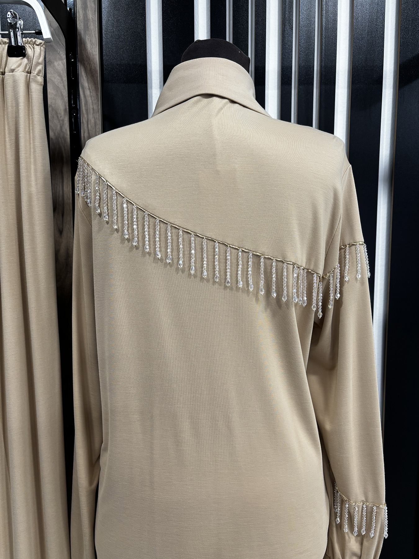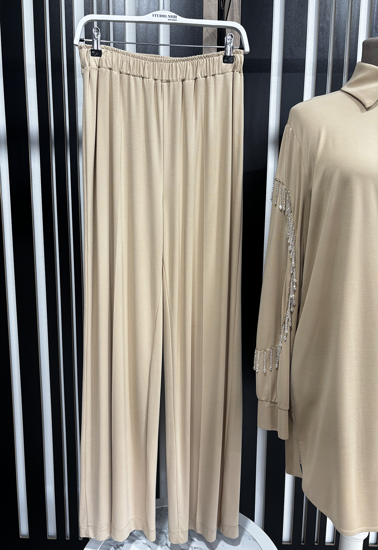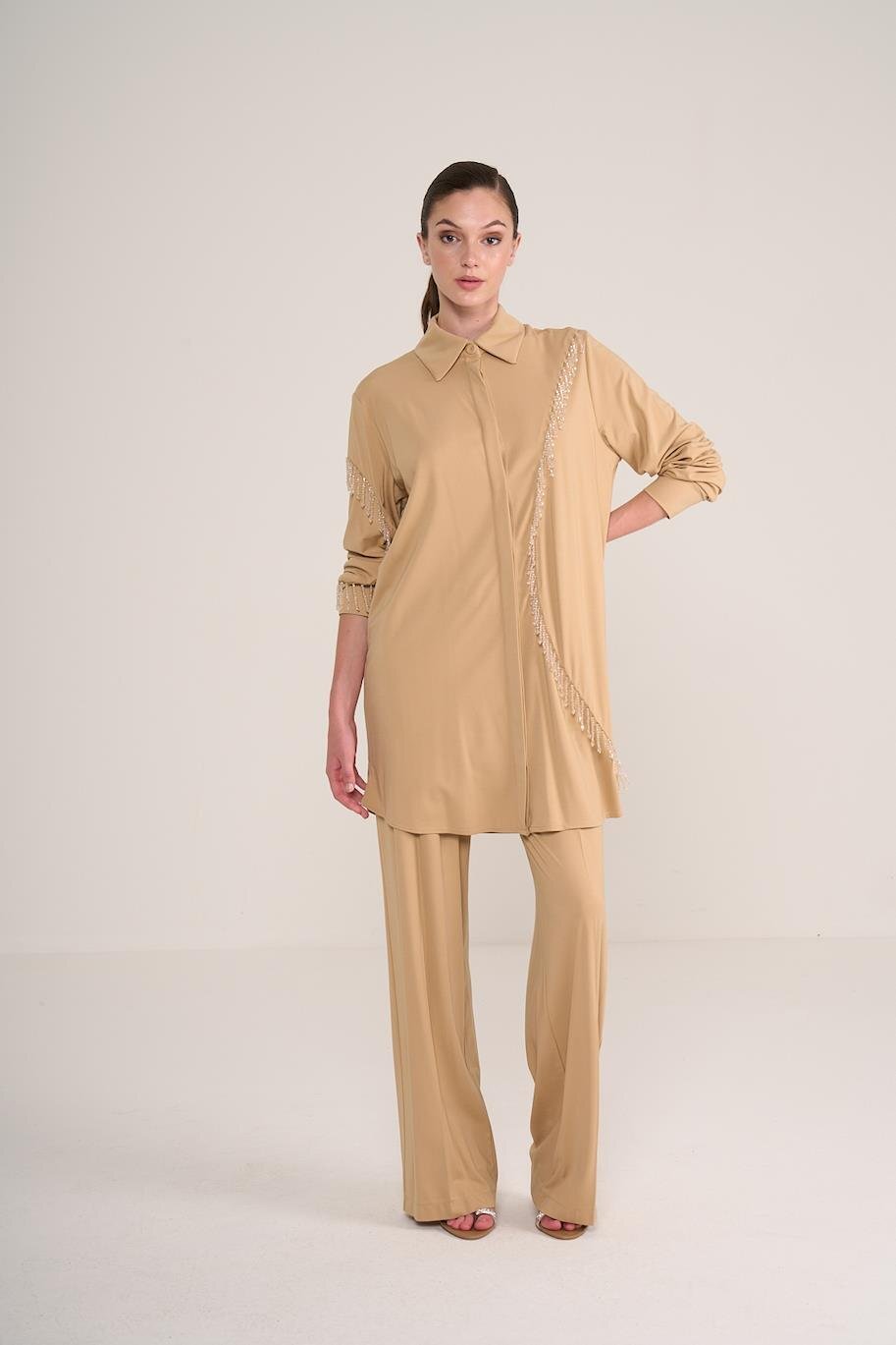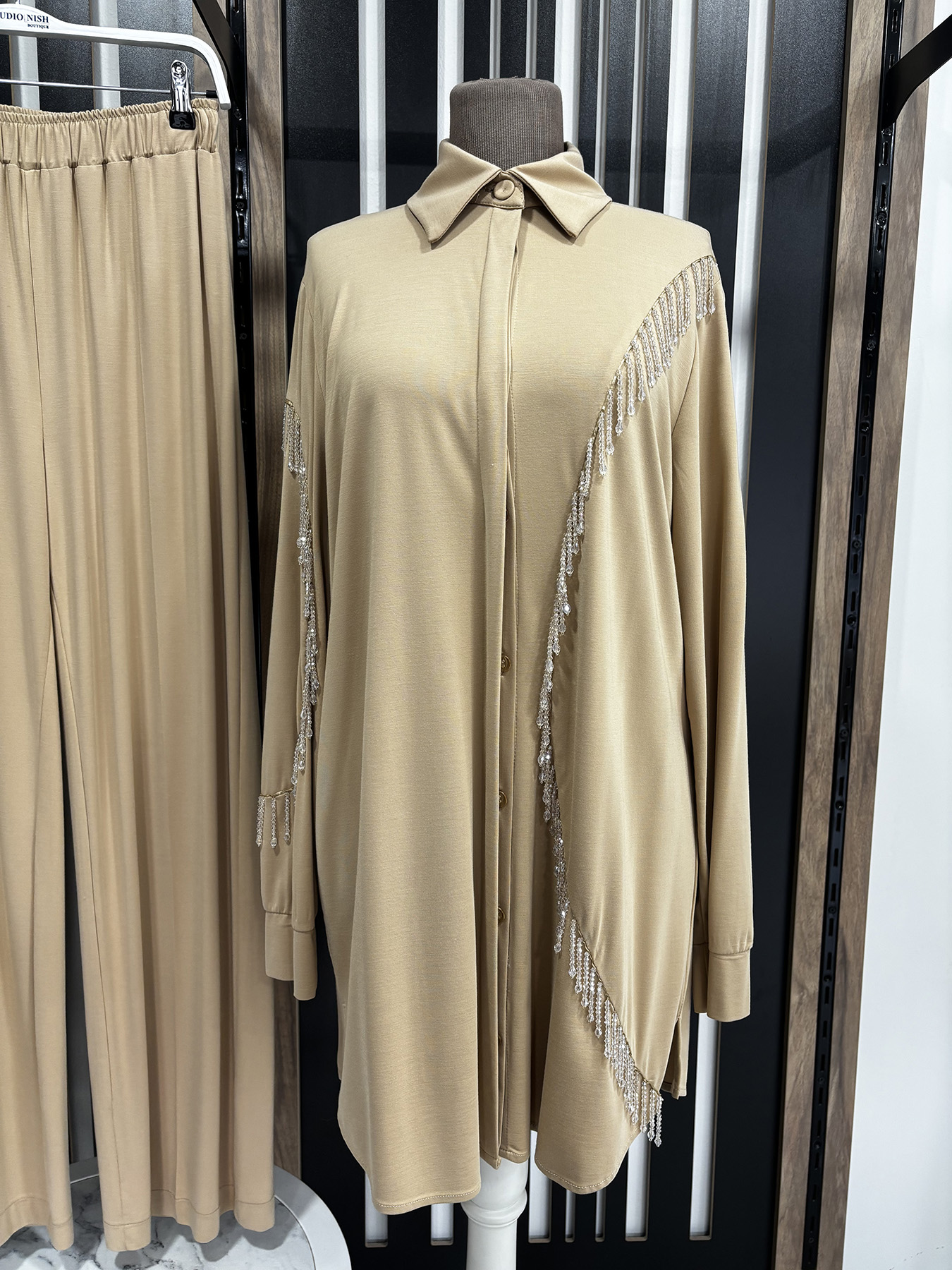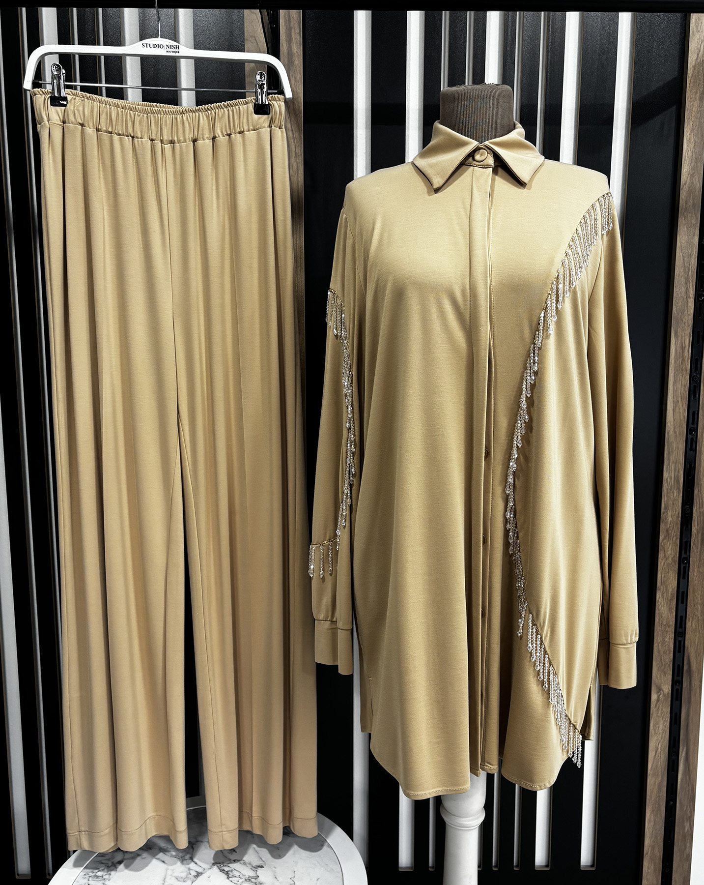Qupra Önü Asimetrik Taşlı Pantolonlu Takım BEJ
