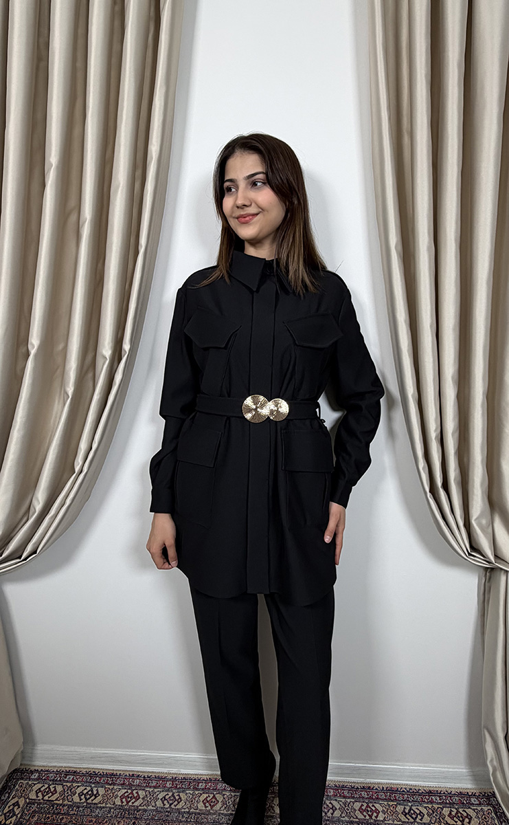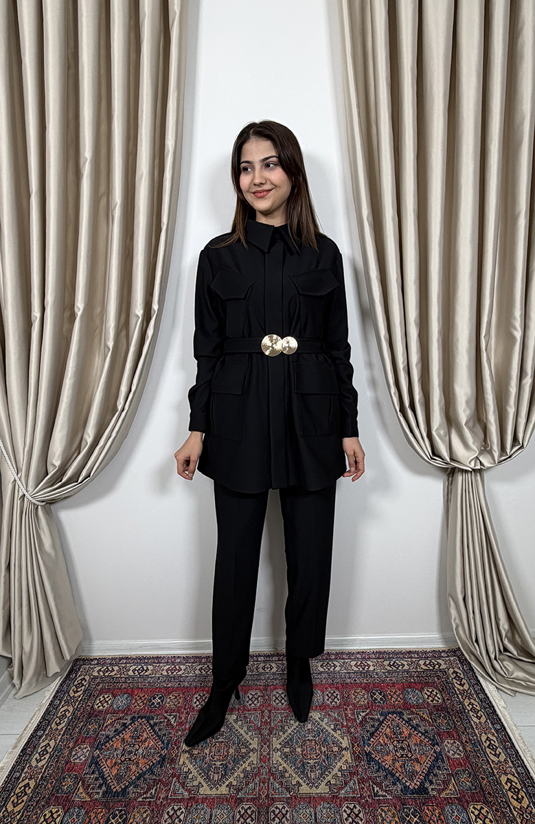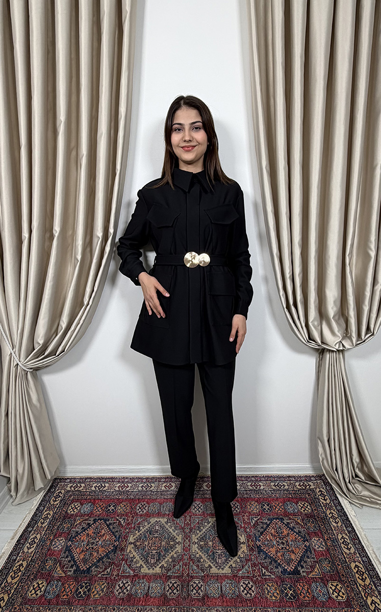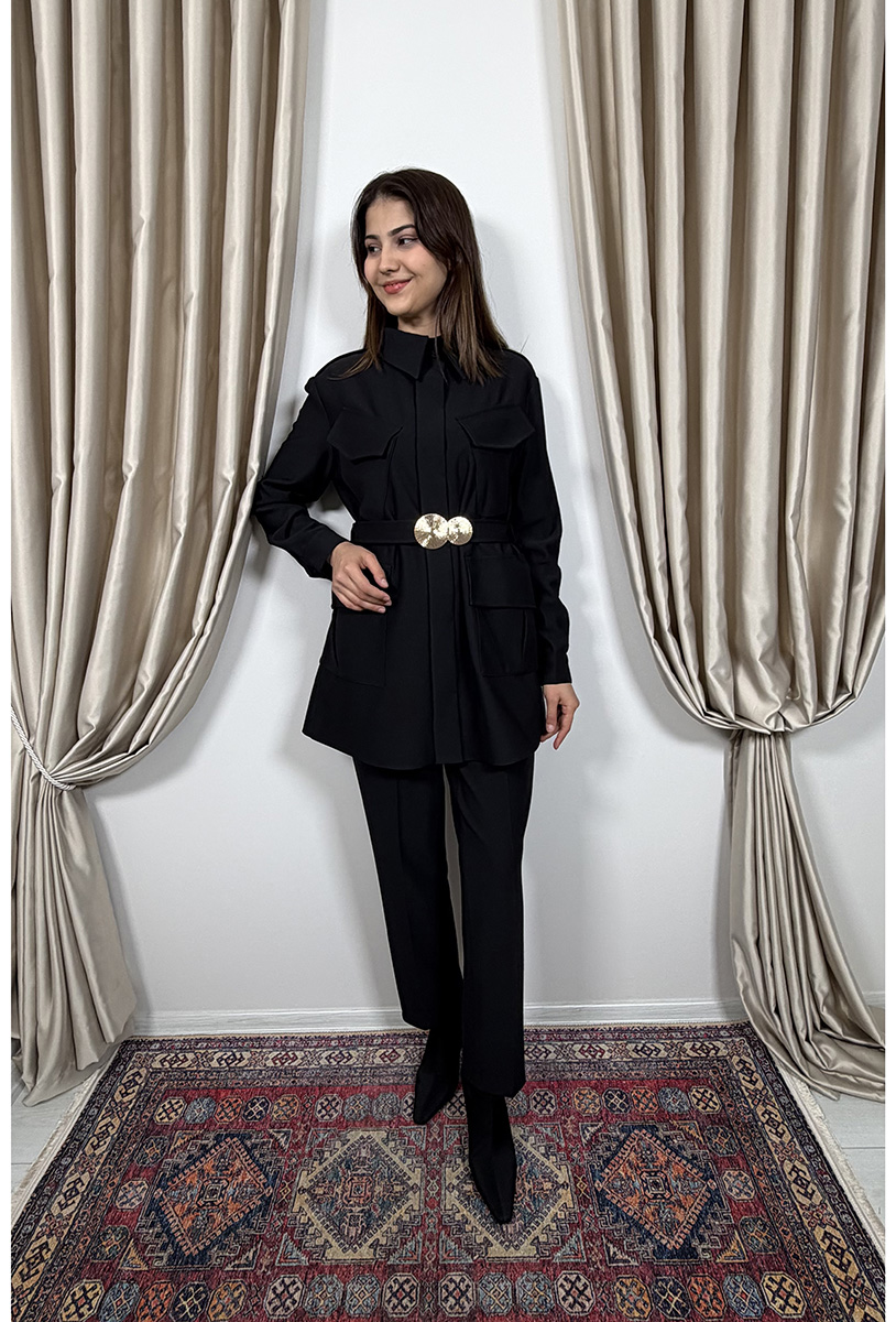 Qupra Önü Cep Detaylı Kemerli Takım SİYAH