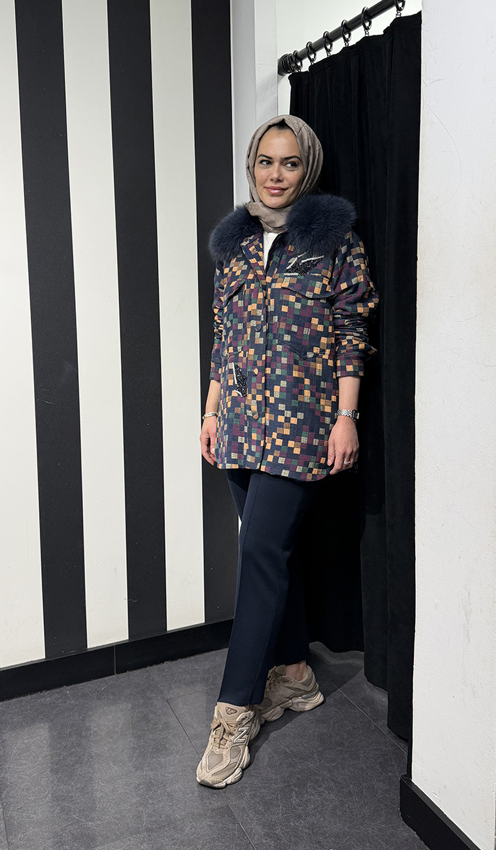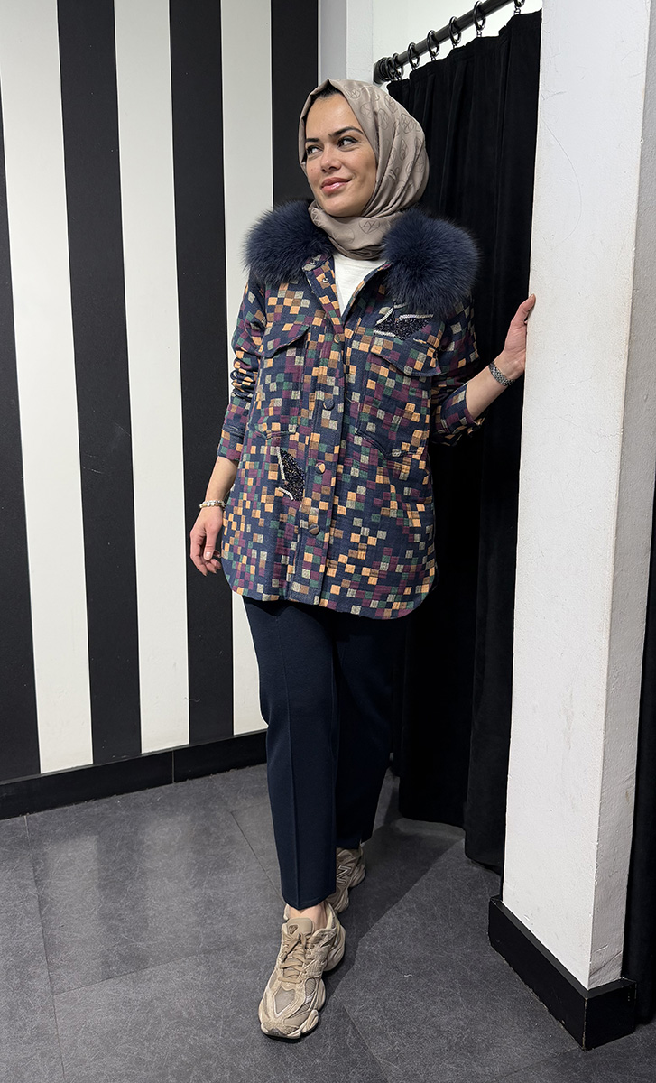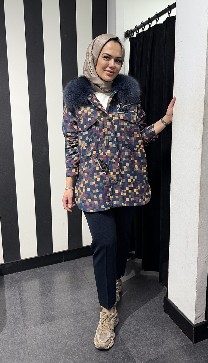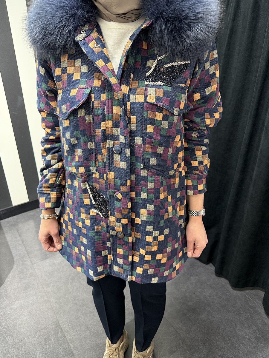 Qupra Yakası Kürklü Pötikareli Ceket ORJİNAL