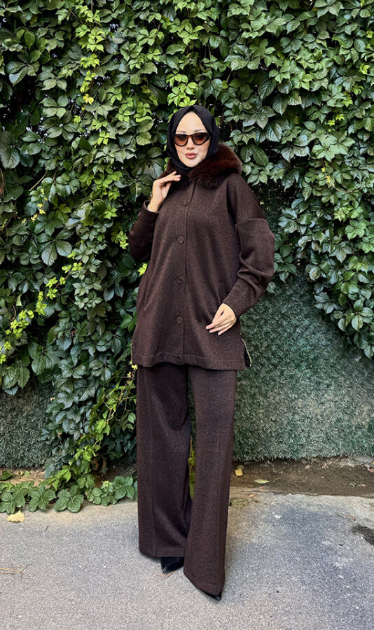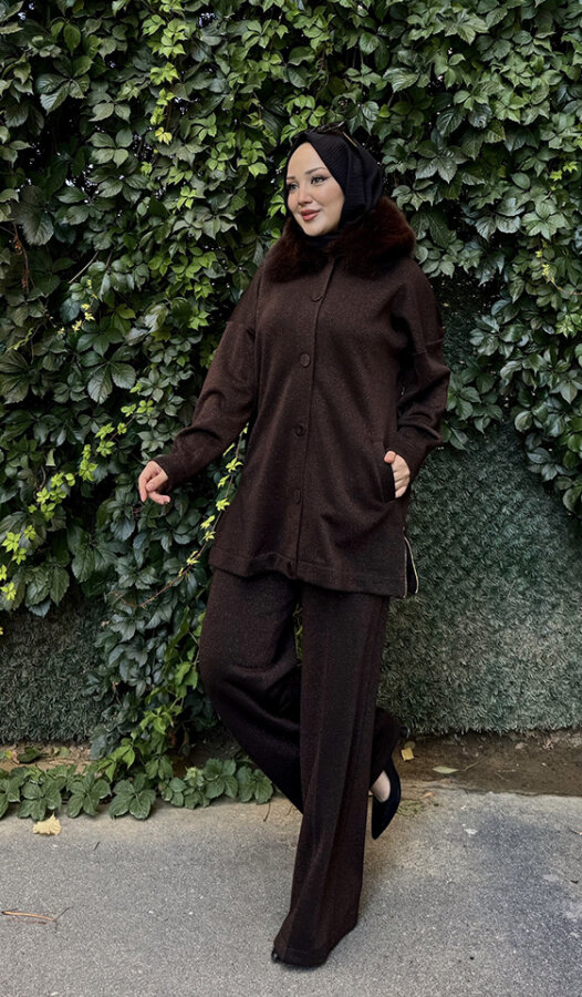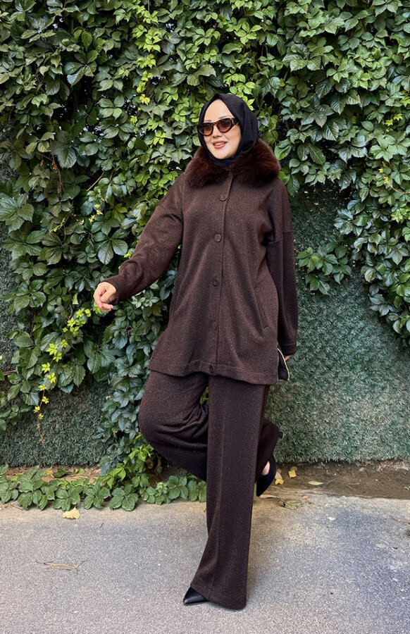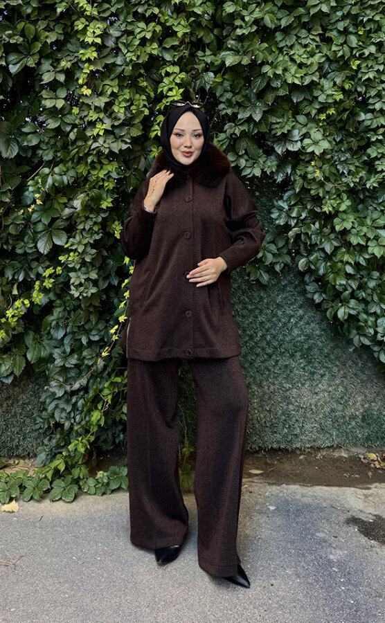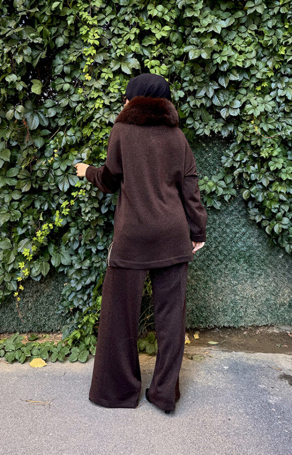 Qupra Yakası Kürklü Simli Takım KAHVE