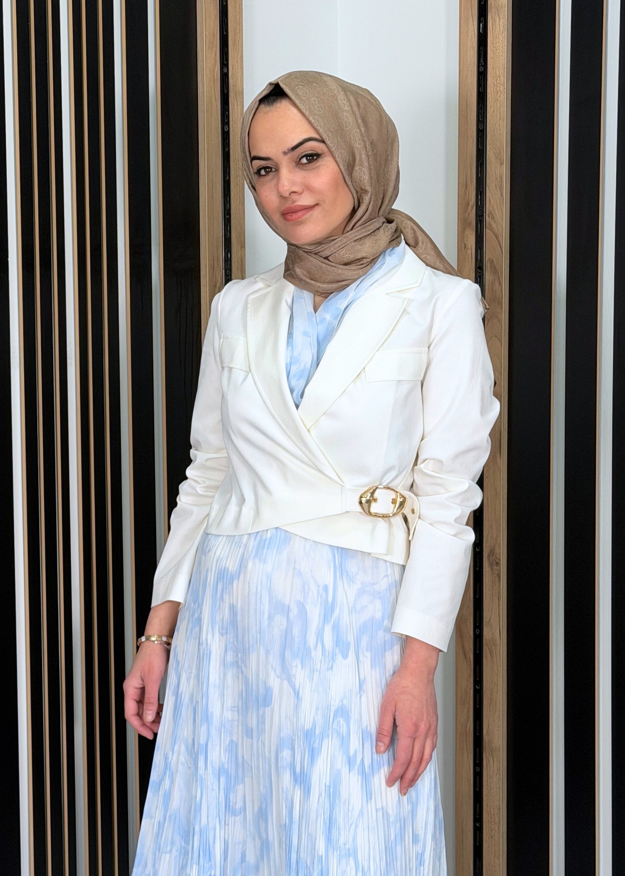 Si Design bel kısmı kemerli ceket, tesettür kombinlere modern ve şık bir dokunuş katar. Kemer detayı sayesinde isteğe göre vücuda form verilebilir, açık kullanımda ise daha rahat ve dökümlü bir görünüm elde edilir.