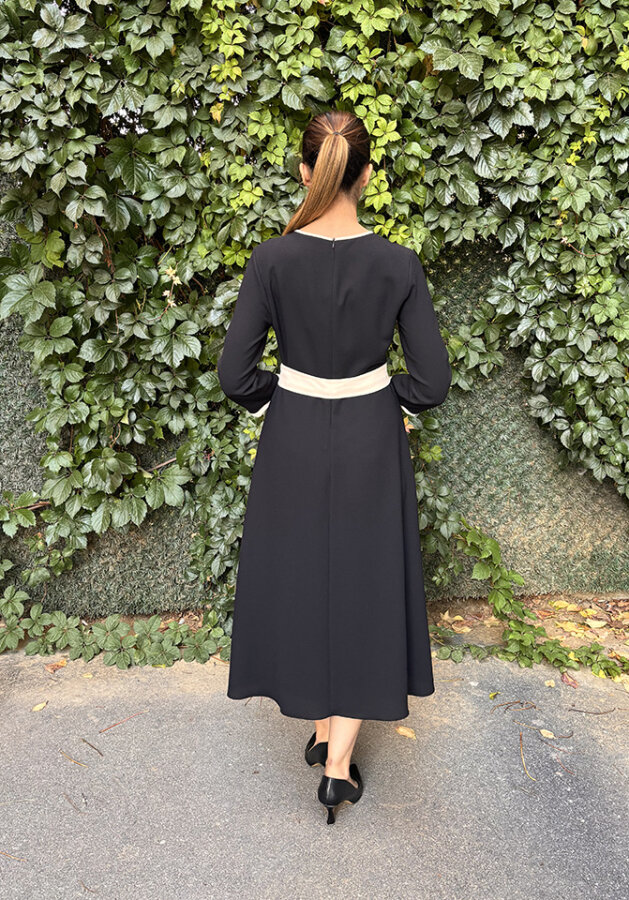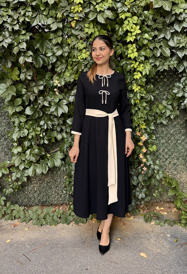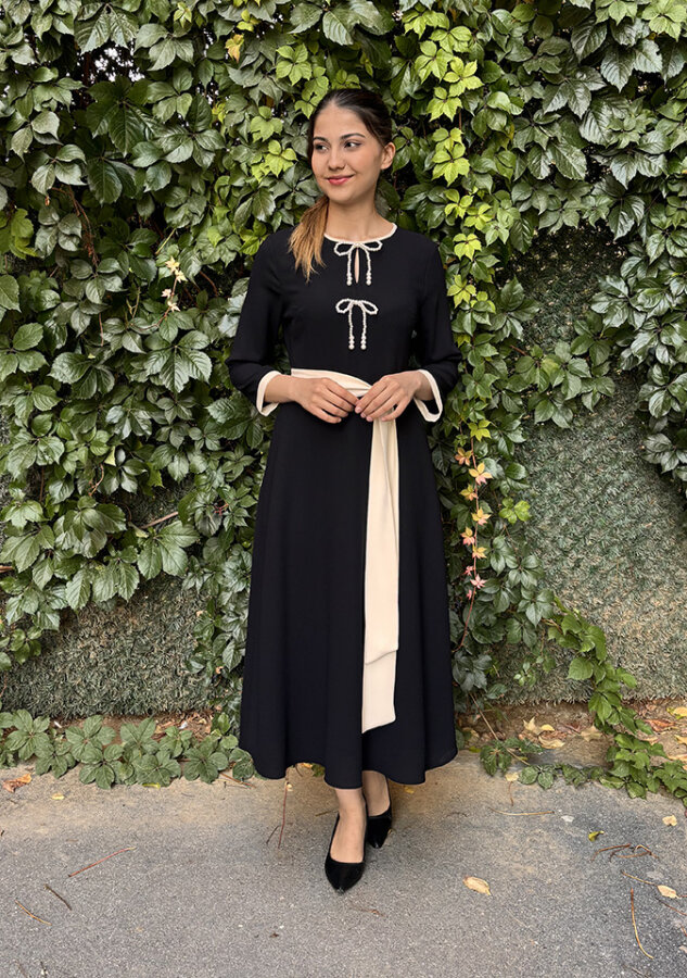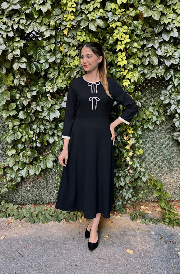 Si Desing İnci Detaylı Biyeli Elbise SİYAH
