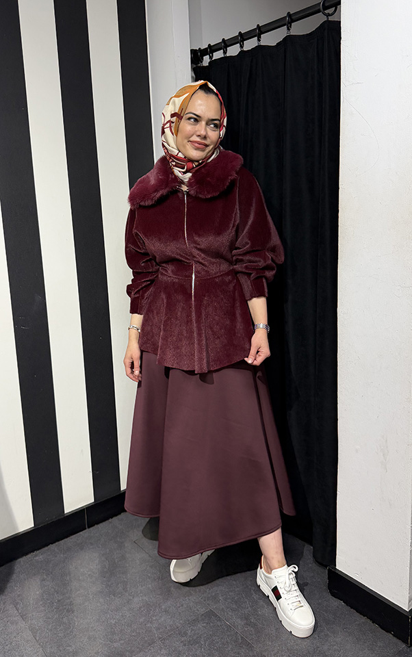 StudioNish Bella Yakası Kürklü Fox Kaban Burgonya
