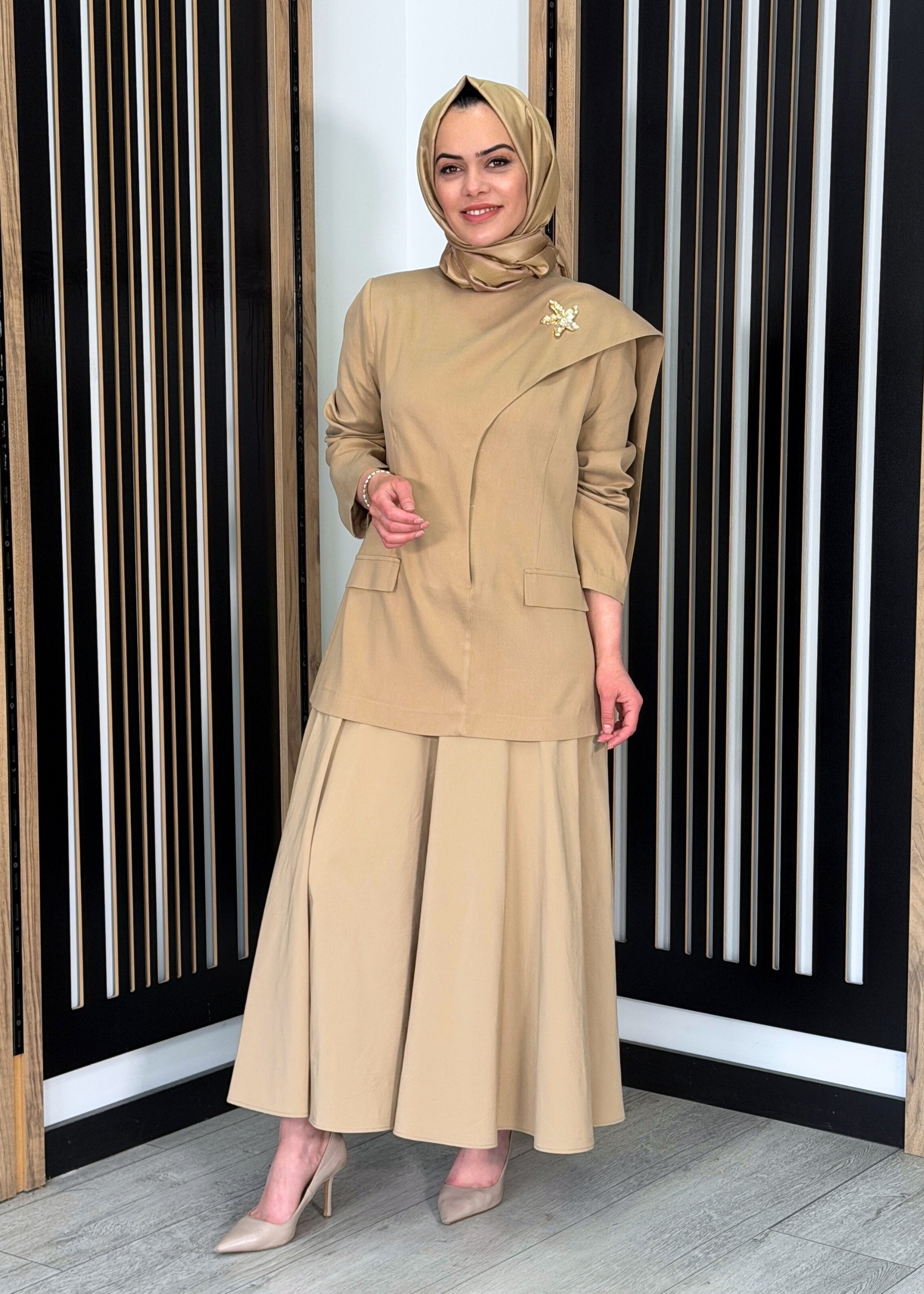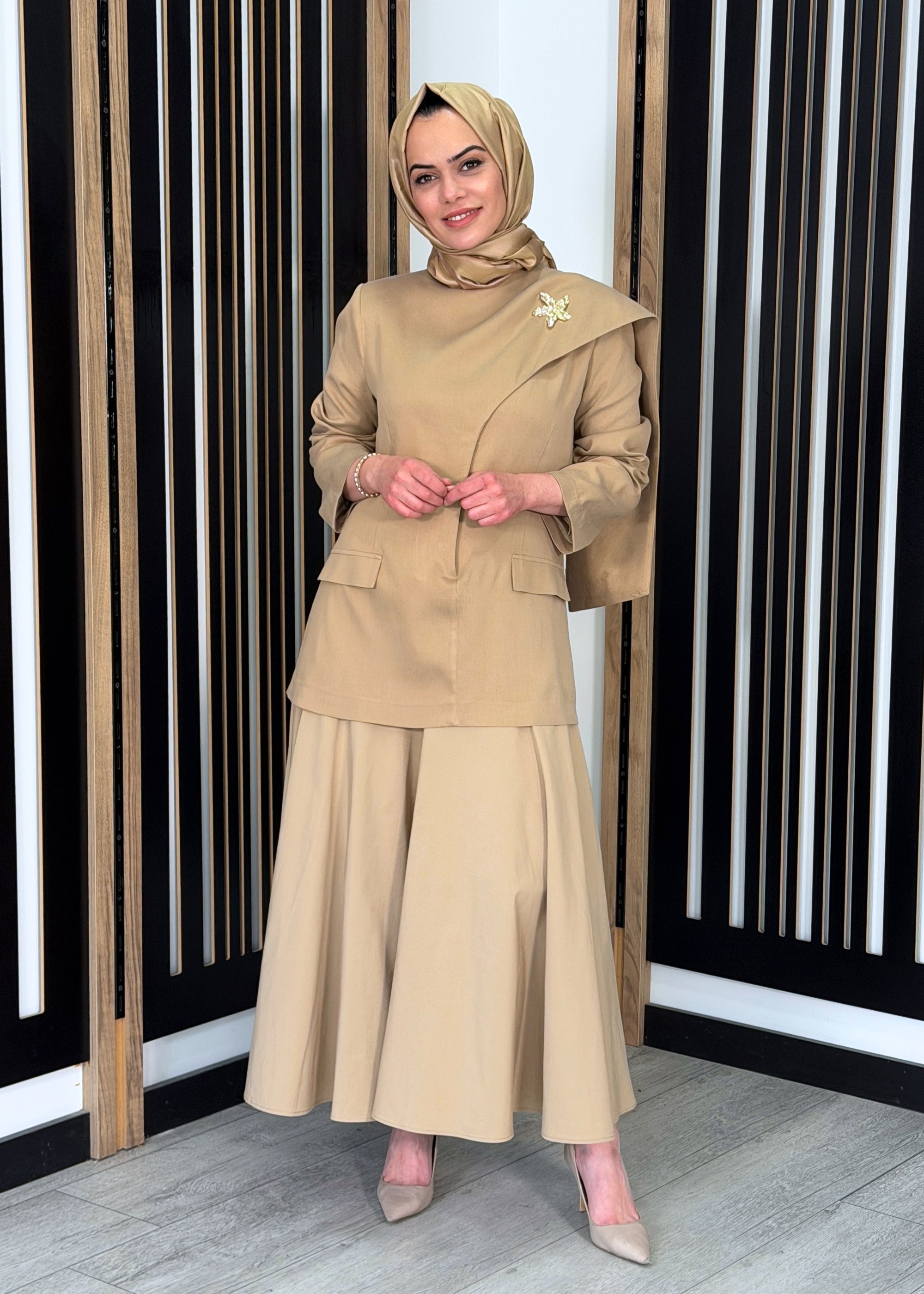 Qupra Kemer Aksesuarlı İkili Elbise BEJ