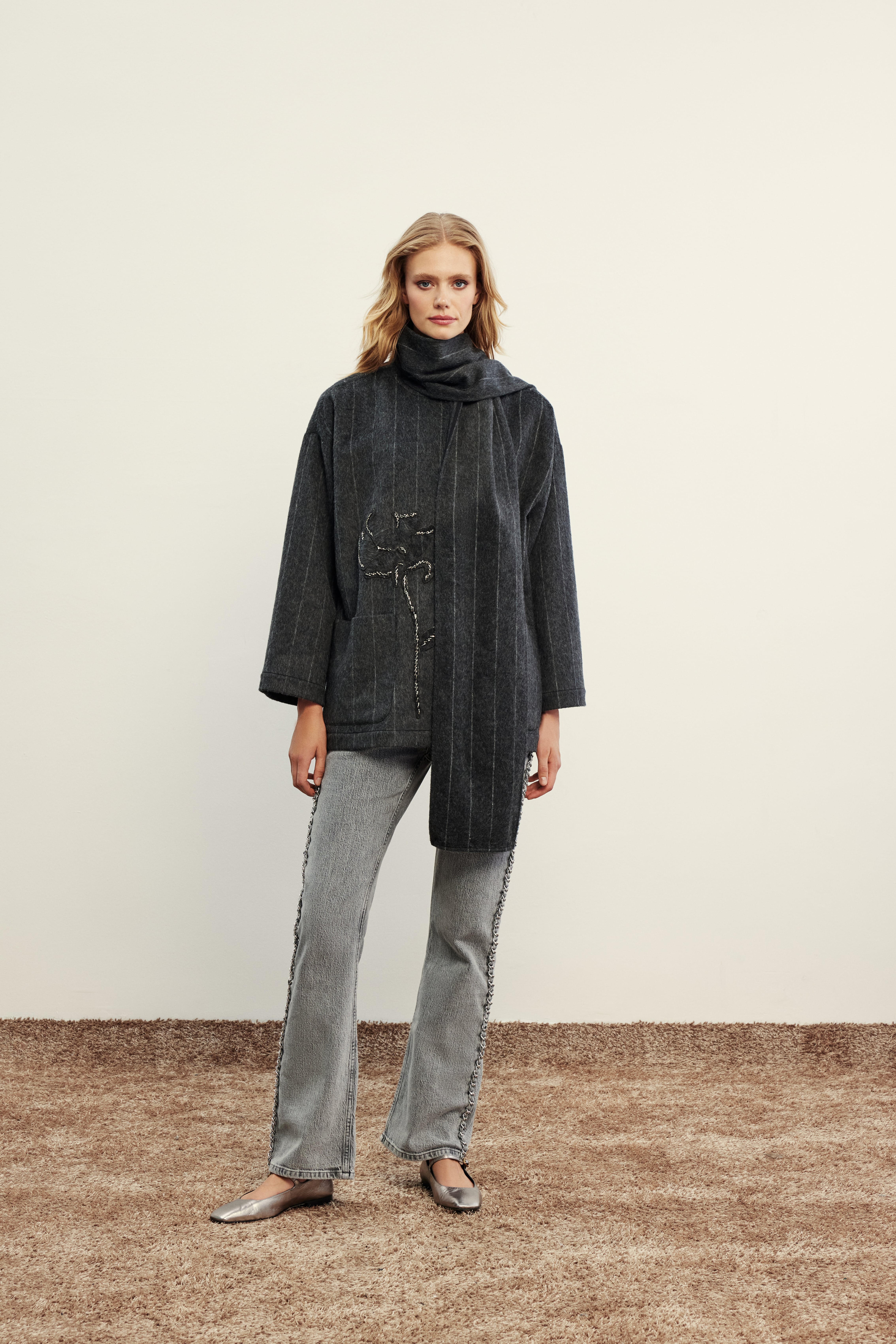 Noi Keçe Flog Baskılı Uzun Düğmeli Kaban KREM