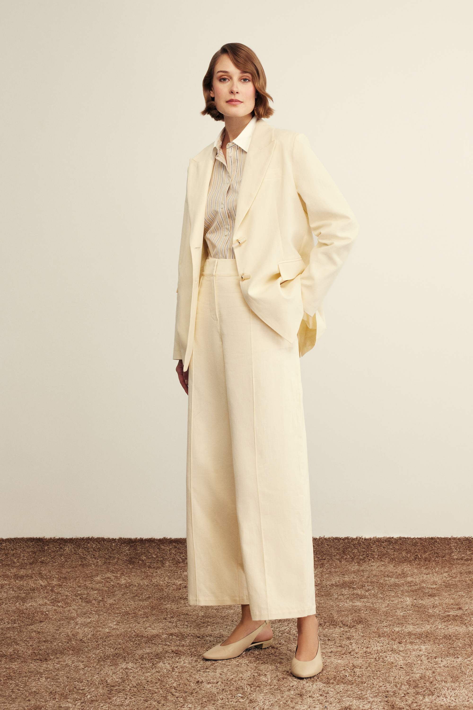 %70 pamuk %30 keten karışım kumaştan üretilmiştir. Pamuk içeriği sayesinde nefes alabilen ve konforlu bir yapı sunarken, keten dokusu ile hafif, doğal ve ferah bir kullanım sağlar. Yaz ve mevsim geçişleri için ideal, hafif ve şık bir kumaştır.