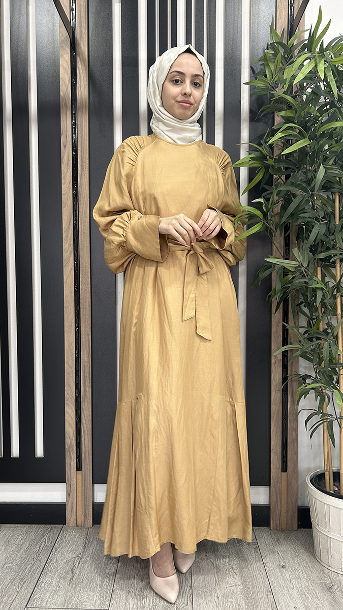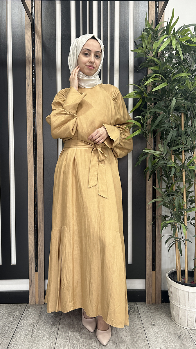 Vuu Önü Nervürlü Yarasa Kol Elbise SARI