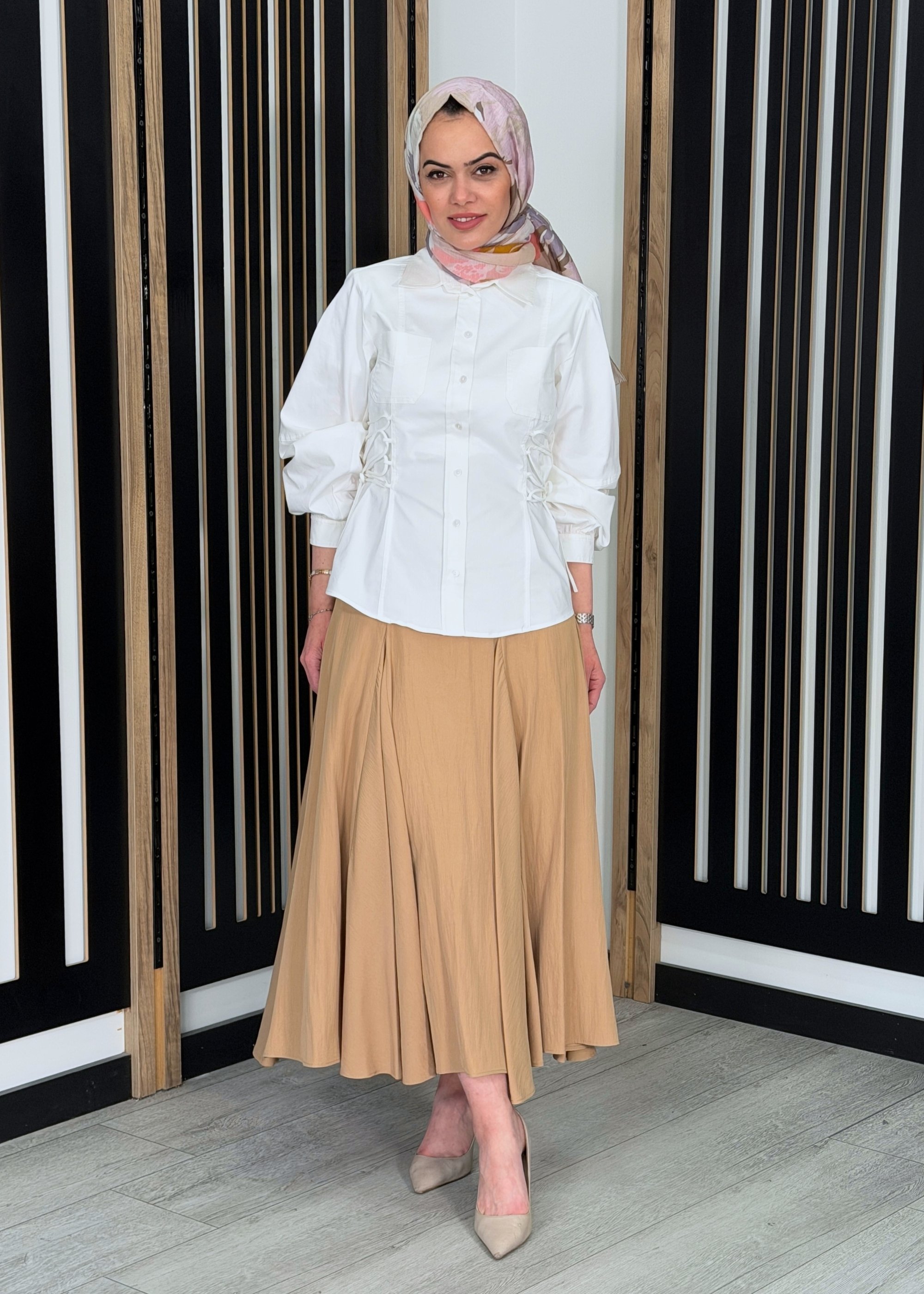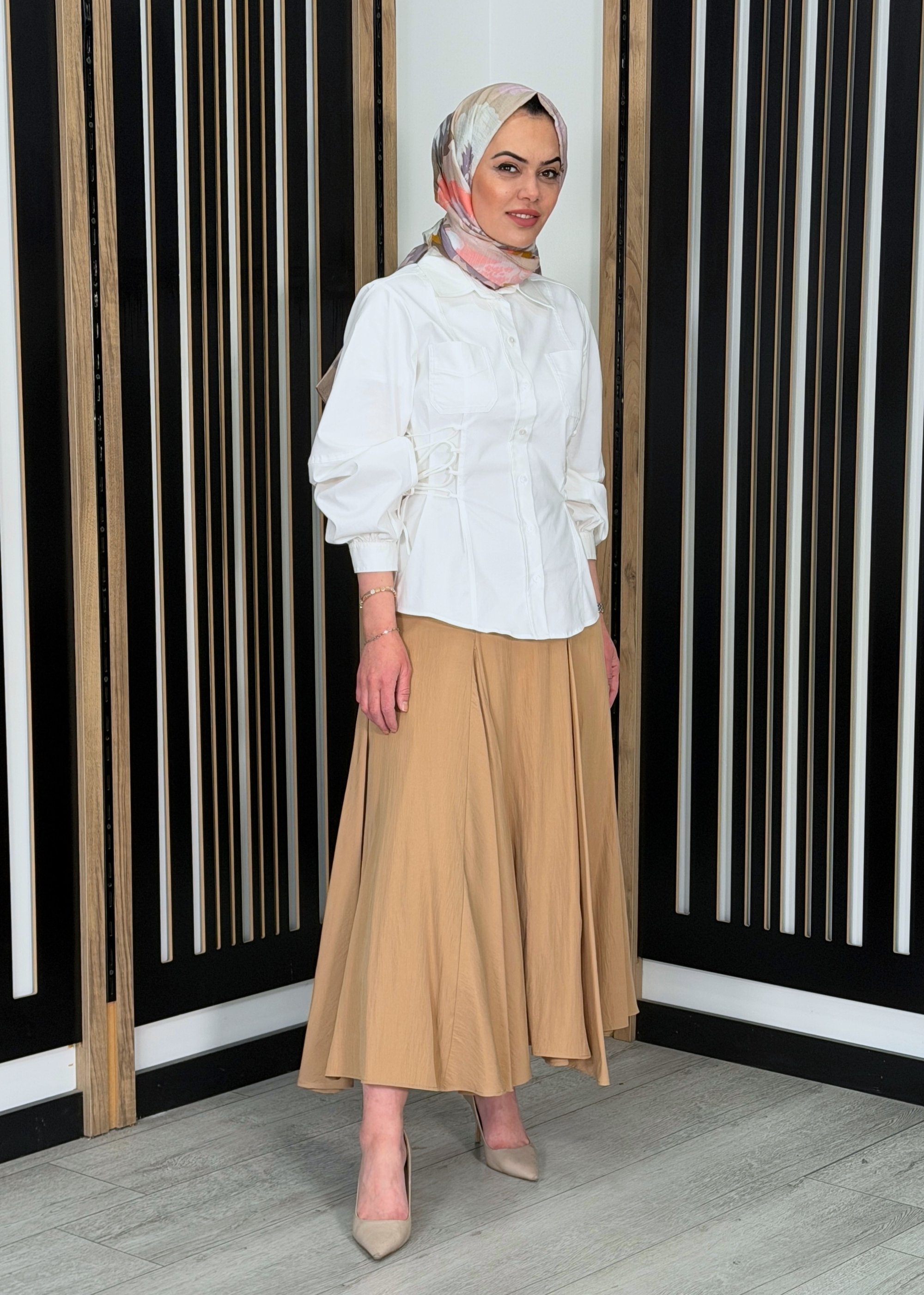 Zarif pile detaylarıyla hareket kazanan bu etek, tesettür giyimde şıklığı ve rahatlığı bir arada sunar. Günlük kombinlerden ofis stiline kadar geniş kullanım alanına sahiptir.
