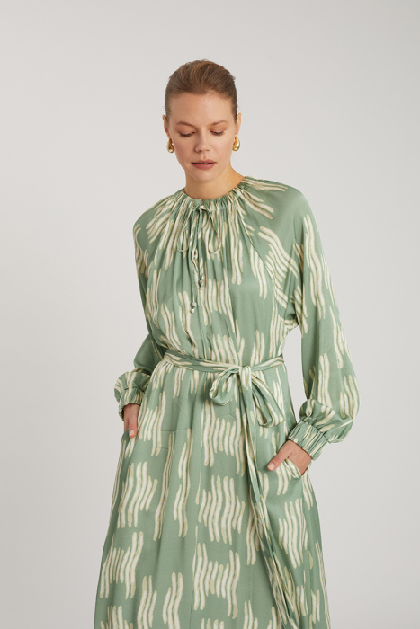 Desenlerin ve renklerin hakimiyetinde göz alıcı bir görünüm sunan elbise, büzgü yaka kesimi ile modern ve güçlü bir silüet yaratıyor.Kuşaklı elbiseyi zarif topuklu ayakkabılarla kombinleyerek gündüzden geceye şık bir görünüm elde edebilirsiniz. -Cepli -Astarsız -Kuşaklı -Kol manşeti lastikli -Ürün boy: 145 cm